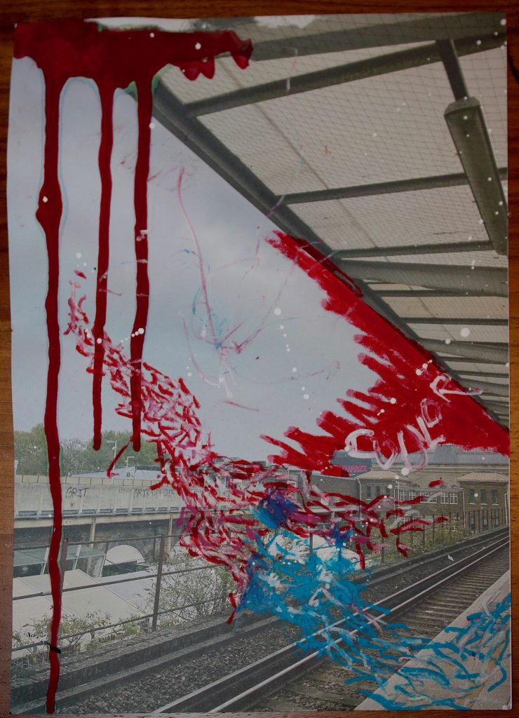 2- In this piece i have done the opposite. i have contrasted the greys and dull colours of the background with vibrant blues and reds taken from various places and marks i have seen all over London. This really emphasises the idea that the context and surroundings of a colour can change it completely. i have seen these colours amongst various graffiti walls all over London in places like Shoreditch and Hackney wick but only now i feel they are at their mot vibrant.