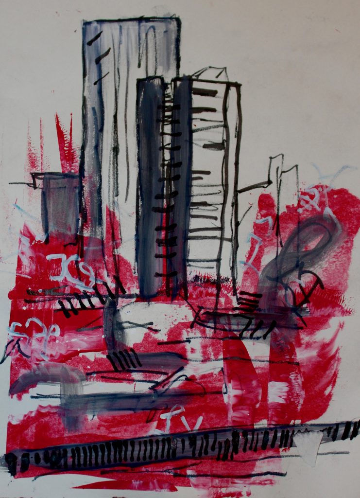 These paintings and drawings are inspired by the views and environment around me. I sense these elements and describe them using colours, materials, shapes etc. I walked around London, Vancouver, and China and all of these places inspired me to finish these. Some of the work are inspired by pictures and memories. I like to combine different cultures together. My work are not focused on realistically drawing but in an exaggerated way. I used oil pastels, watercolour, paintings, spray paint, and markers for my work. I mixed different textures and see how they work together. I really enjoy this task and this made me to really explore the colour and pattern.