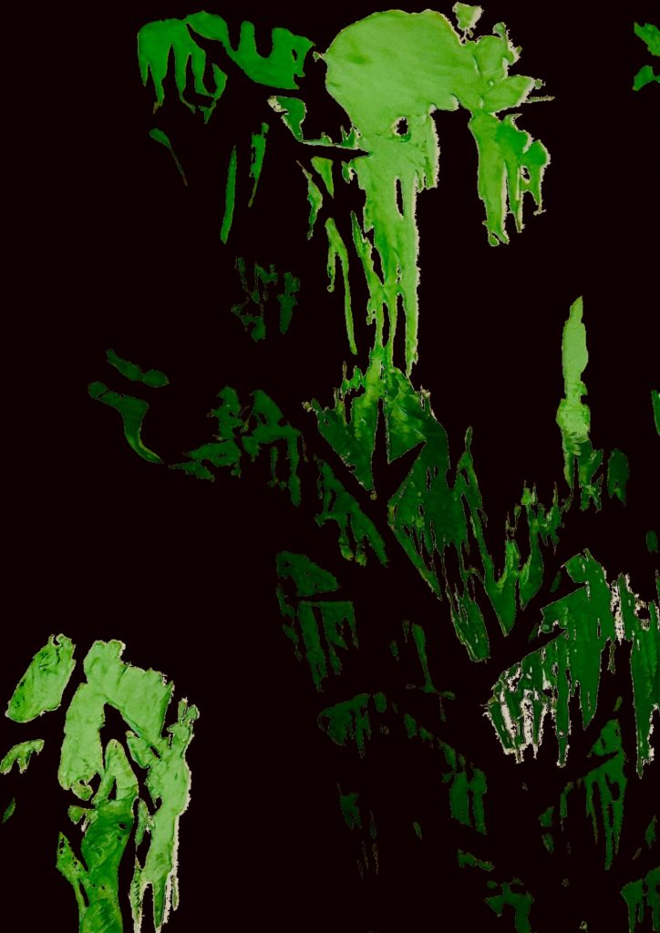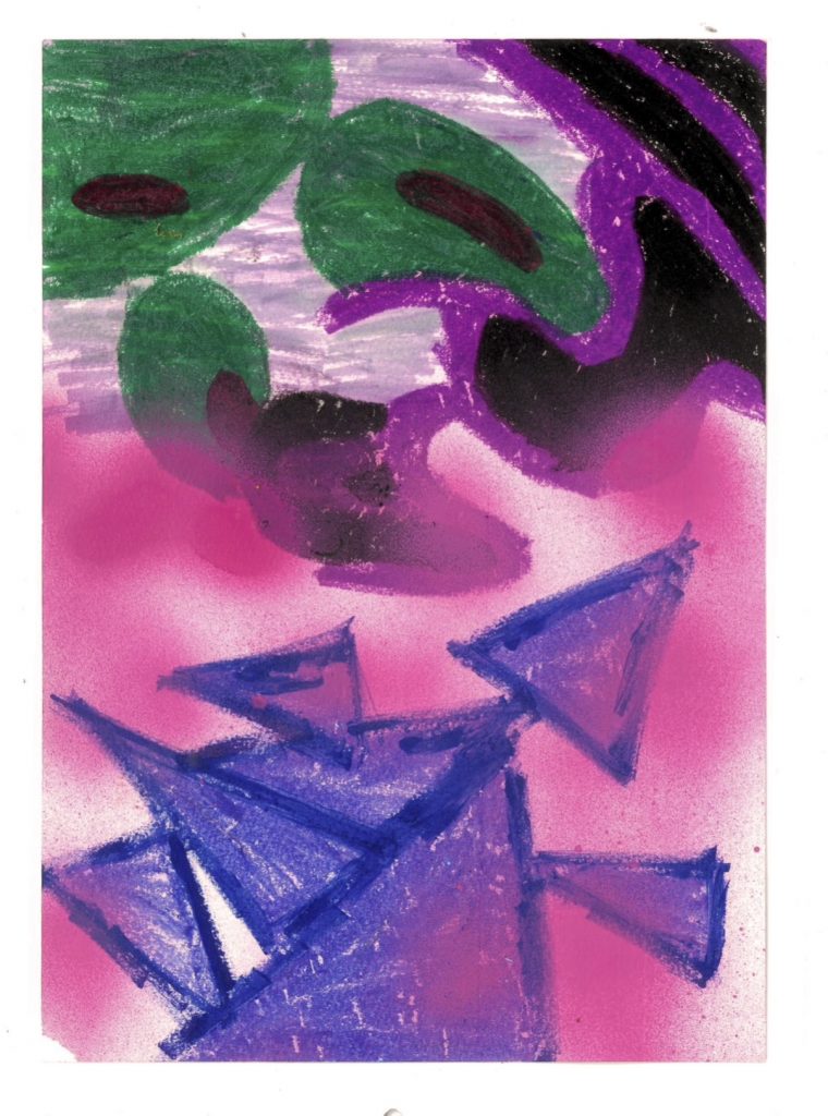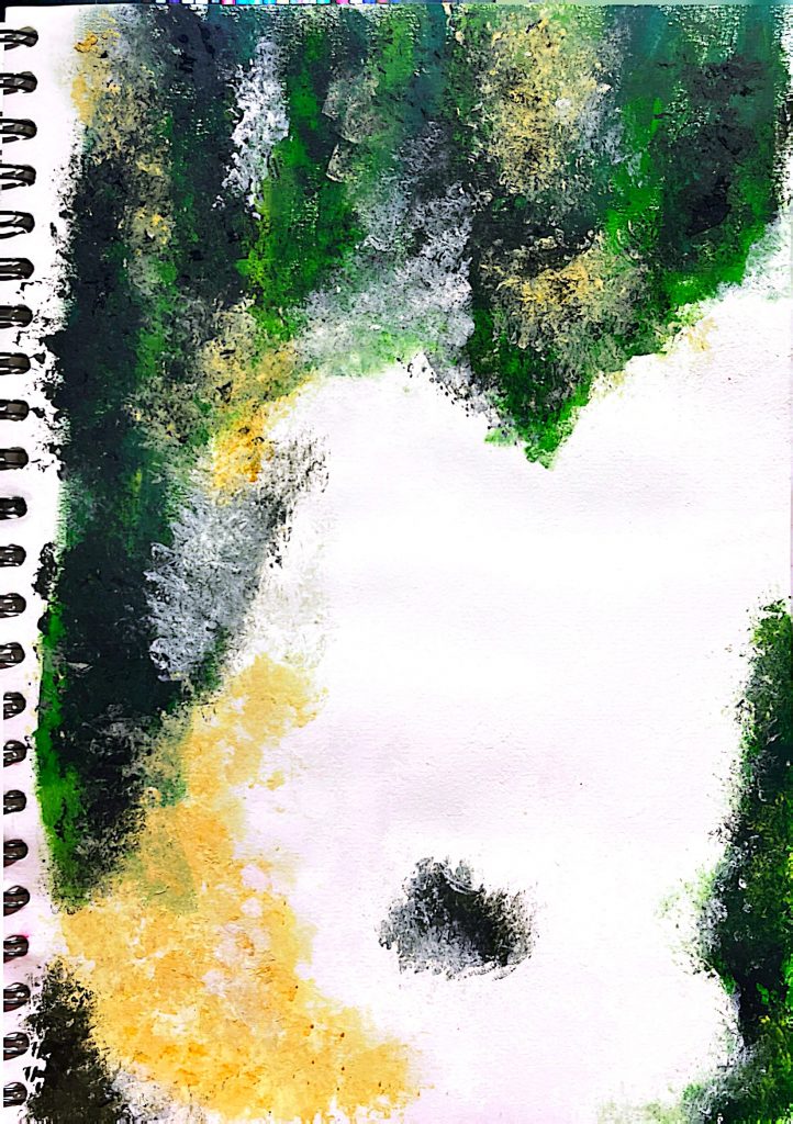 3 & 4. Both works are derived from a small, greenish, peeling fragment of a building that I photographed during a group practice activity at the start of the semester. One was created using acrylic on paper, while the other was made with crayon and pastel.