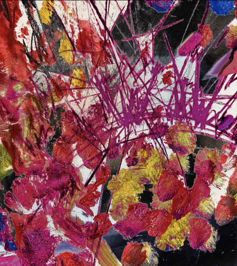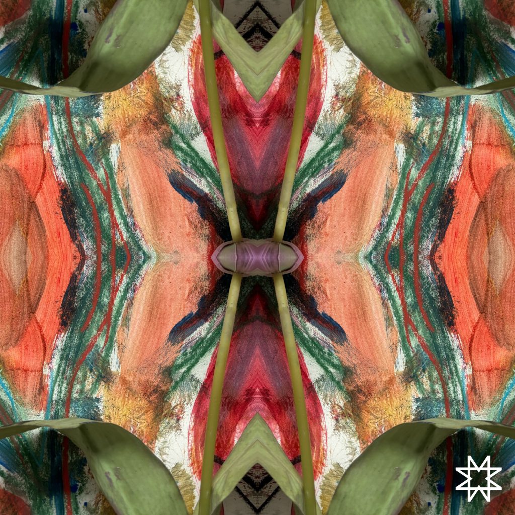 11. To develop this piece further, I decided to use the app ‘Mirrorly’ again because I thought the colours and the different types of mark-making would work really well with the mirrored effect. I really like how the symmetry completely transforms the original pattern — it feels more structured and balanced, but still keeps the expressive and organic quality of the paint. The mirrored shapes almost create a new flower-like form in the centre, which I find really interesting. I also love how the repeated lines and colours draw your eye inward, giving the whole piece a sense of movement and depth.
