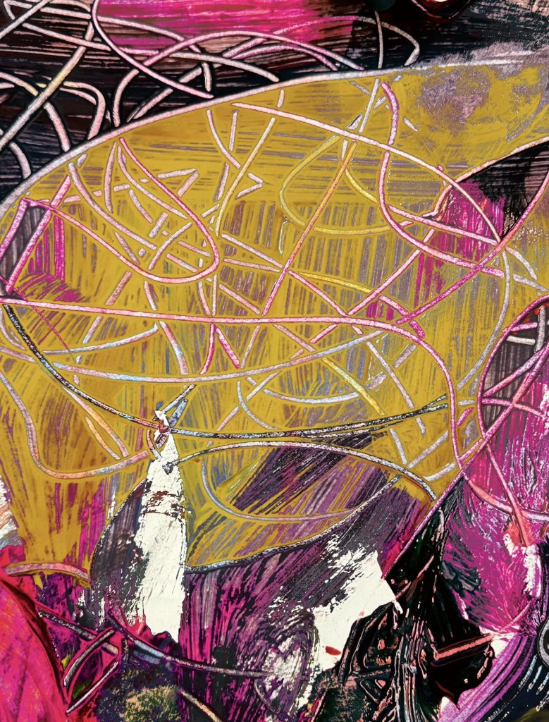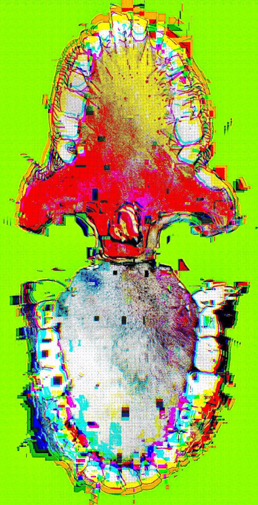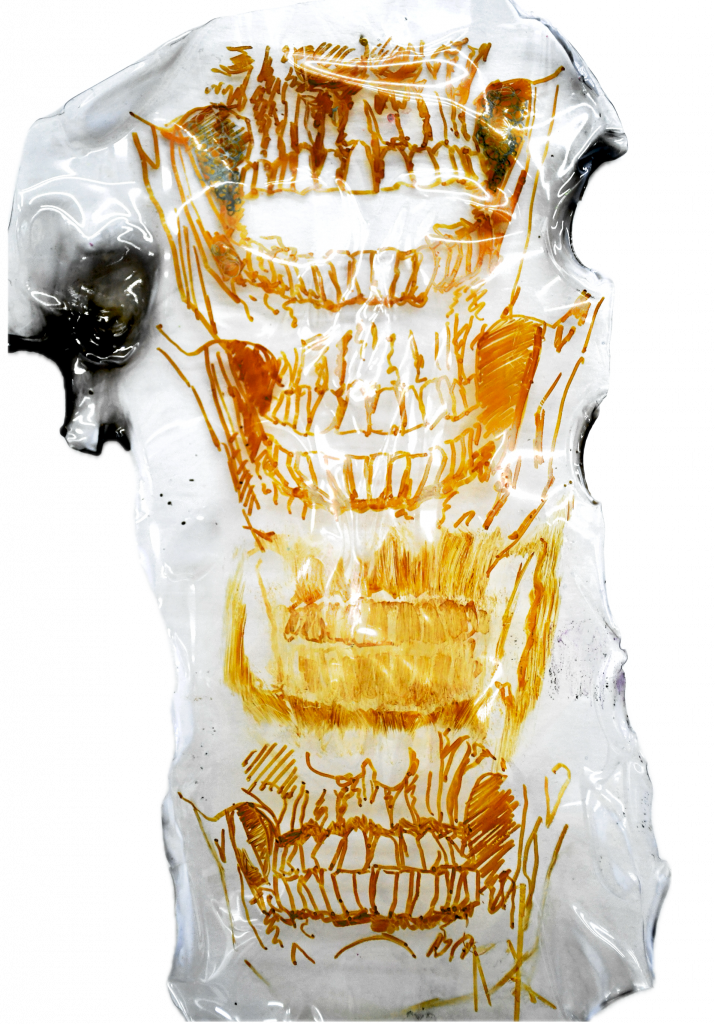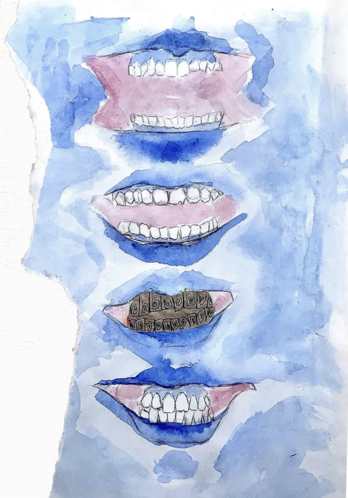 During my illness, the pain and subtle tremors in my throat and teeth became the focal point of my contemplation. Unable to explore the external world, I turned inward, examining these subtle shifts in bodily sensation and emotional fluctuations. Using watercolour, ink, and coloured ballpoint pens, I employed a layered drawing technique to capture the body’s rhythms and instabilities, transforming the tremors of my teeth and the state of my mouth into multi-layered visual records. Through repeated layering and transformation of these forms, the paintings emerged. I transform these into print-like compositions, experimenting with colour, transparency, and visual rhythm. This process serves both as personal documentation and as an exploration of how materiality and repetition can visualise inner discomfort. Through layering and distortion, I convert bodily fragility into patterns suggesting tremors, anxiety, and metamorphosis, reflecting the intertwined realms of physical experience and emotional perception.