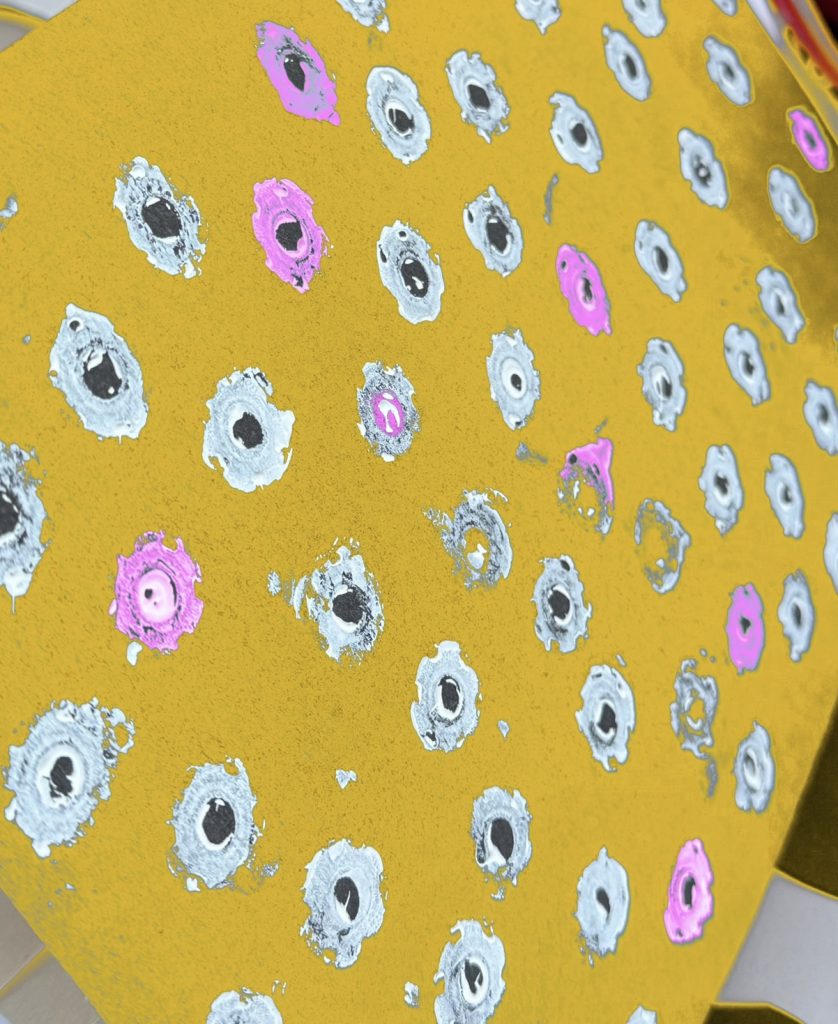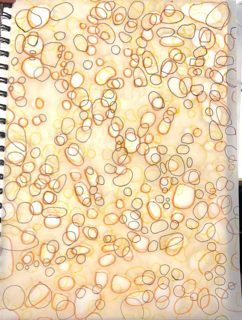 For this task, I conceived numerous ideas involving objects, mediums, and colors, yet the final selections emerged through a process that felt both random and interconnected. For instance, while sneaking some small biscuits during the teacher’s lecture, sunlight happened to stream into the room since it was a clear day. Illuminated by the light, I noticed the tiny round holes in the center of the biscuits—likely designed for ventilation during the steaming process. Later, while painting, my attention was captured by the display board on the right, fascinated by the interweaving colors. Then, as I contemplated which painting materials to use, I found myself drawn to the transparent cup I use for washing brushes. The residual pigment stains left on the cup struck me as a form of printmaking. A series of such interconnected observations ultimately culminated in the final artwork. I also experimented with various methods. For example, in one piece, my inspiration came from the bubbles in a soft drink—I took a photo of them and began thinking about bio-fabrics. Lacking the proper tools, I improvised by adding dish soap to watercolor paint, vigorously stirring the mixture with a brush to create foam, which I then skimmed off and applied to paper. I allowed it to dry, embracing the resulting texture. What distinguishes this approach, which I refer to as “talking pattern” and “talking color,” from my previous work is a shift in focus. In the past, I tended to prioritize whether the overall shape accurately reflected the original subject. However, inspired by a recent Tuesday class, I now place greater emphasis on texture and color effects. I find it particularly intriguing to transform limited imagery into unique patterns. Moreover, by reviewing examples from online classes, I’ve gained a clearer understanding of what I currently need—or what I still lack. I am also actively experimenting with combining different mediums to explore new effects.