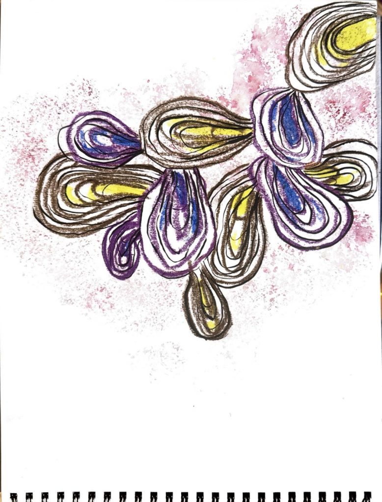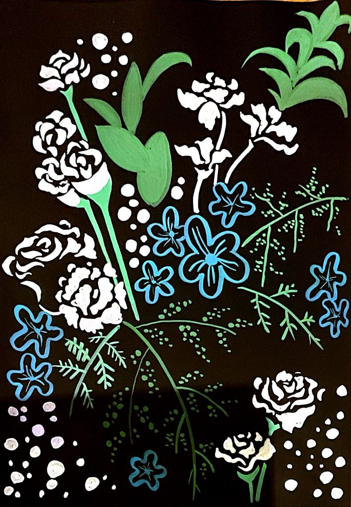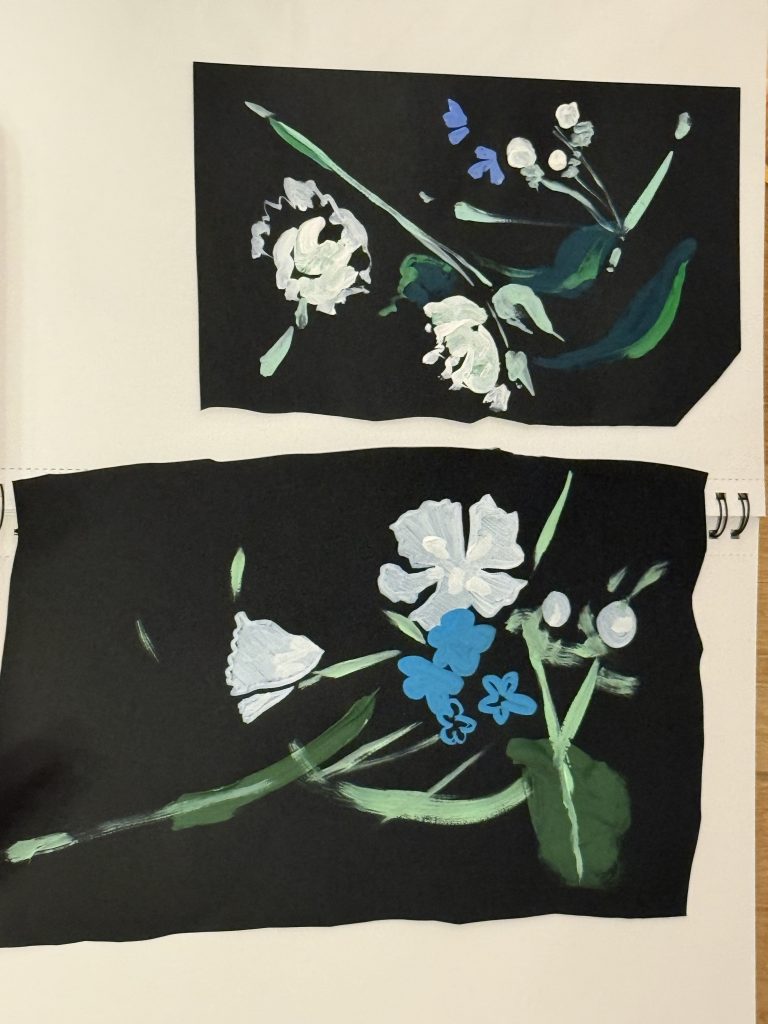 3.This floral pattern holds a deep personal meaning for me because it’s inspired by a flower from my grandma’s greenhouse back home. I made sure to add different colour shades to the flower to add texture, but I feel like next time i could’ve added a black fine liner pen to the painting to give more of a defined look. The colors and shapes in this design bring back memories of spending time with her, surrounded by the plants she cared for so patiently. The soft blues and deep purples make me feel calm and connected to home, while also expressing a bit of who I am through art. Creating this pattern lets me hold onto those memories and feelings, turning something personal and meaningful into a piece of work. I really enjoy the watercolours in this painting because they create a soft and calming effect that makes the artwork feel gentle and natural. The way the colours blend together gives the petals and leaves a smooth, flowing look, almost like they’re alive and moving. I also enjoy how the watercolours add texture and depth, with lighter and darker areas that make the painting look more dynamic and expressive.
