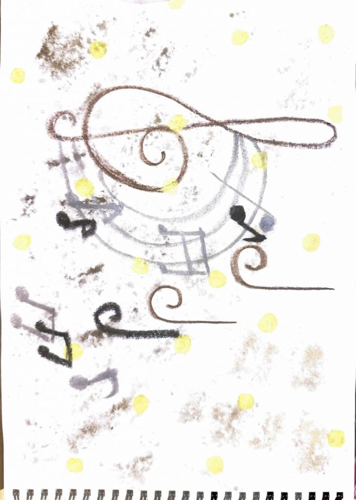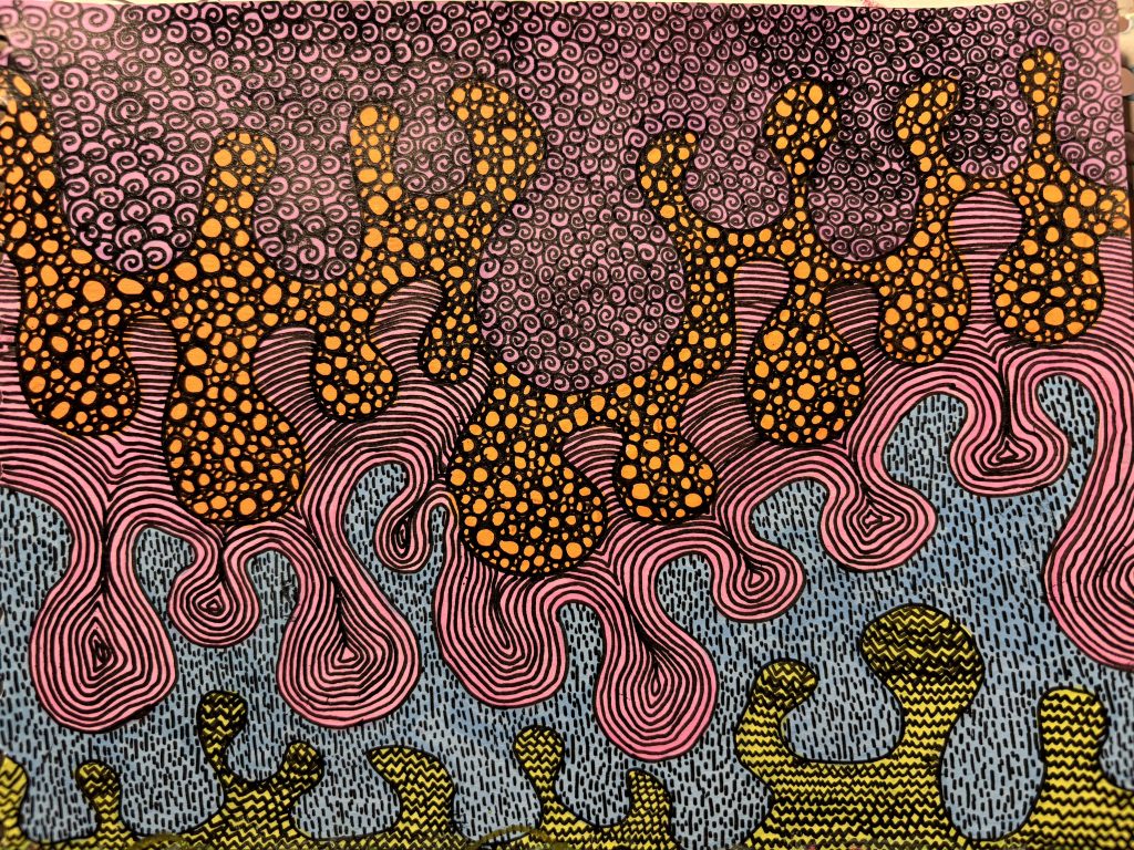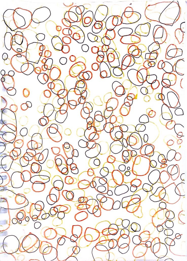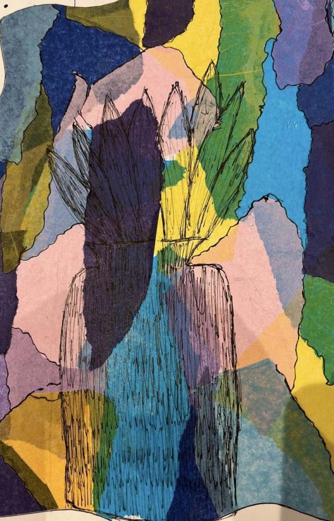 9. This drawing was inspired by a plant pot I came across in my local café. Something about its simple design caught my attention, and I wanted to capture that feeling in my work.To create the pattern effect, I used layers of ripped coloured tissue paper for the background, which turned out really interesting. I love how the different colours overlap and blend with each other, creating new blocks of colour and subtle transitions. It adds so much texture and depth to the piece, making it both visually engaging and fun to touch and look at. This pattern was created through freehand mark-making, where I focused on movement and expression rather than precision. I loved the feeling of letting my hand flow naturally, allowing each mark to develop its own rhythm. The overlapping lines and varied textures give the piece a lively and spontaneous energy.