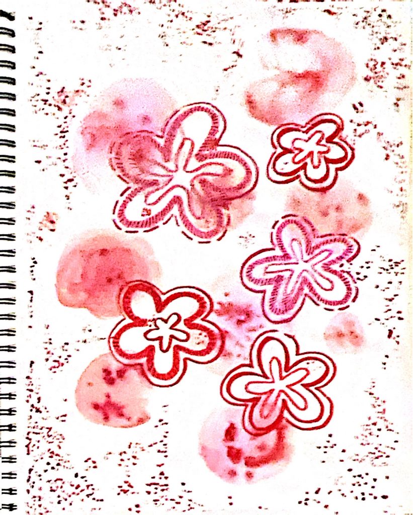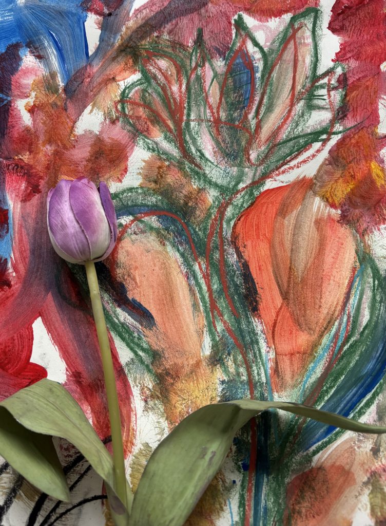 10. This pattern was inspired by the artificial tulip in the photo. I really like how the shapes and colors flow together — the mix of reds, greens, and blues feels really alive. The curved lines from the leaves give the pattern a nice movement, almost like it’s growing out of the page. I also like how the brushstrokes overlap and blend, it gives the whole thing a textured, layered feel. It’s loose but still has structure, which makes it fun to look at and experiment with. For this pattern I experimented with oil pastels and acrylic paint