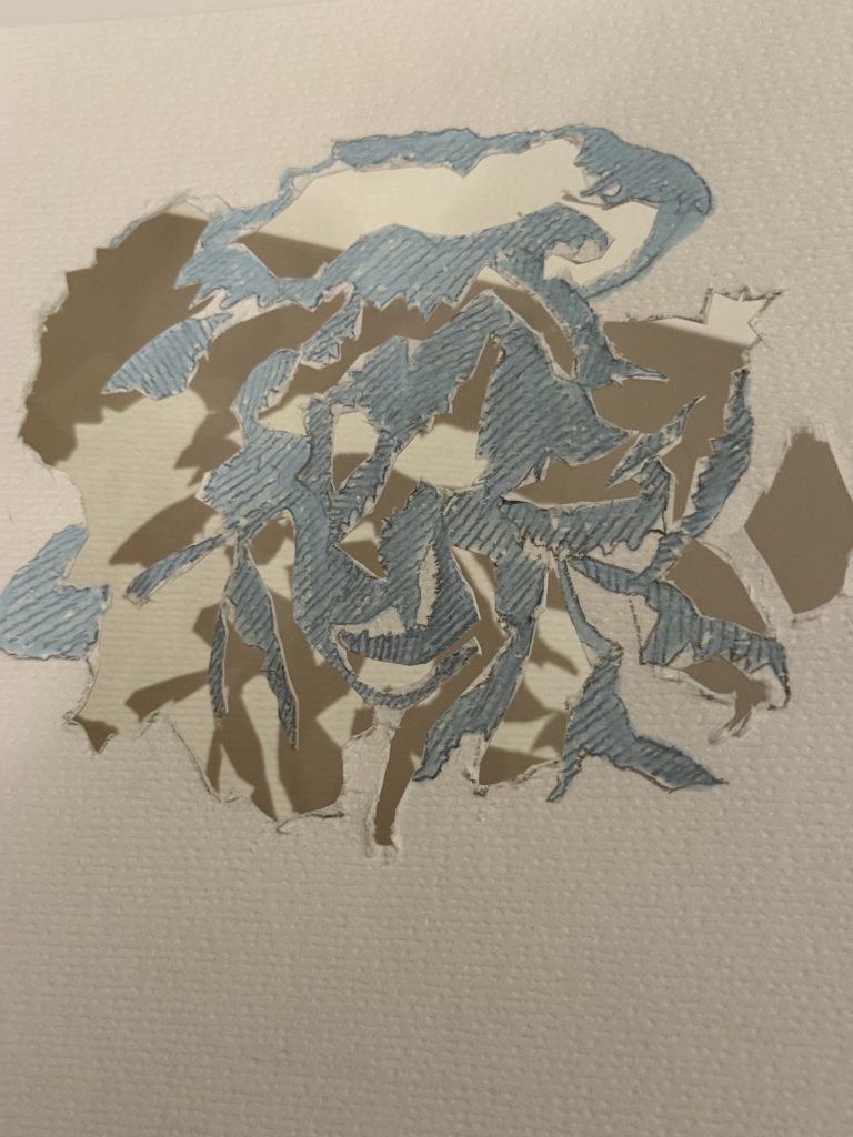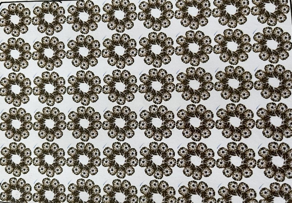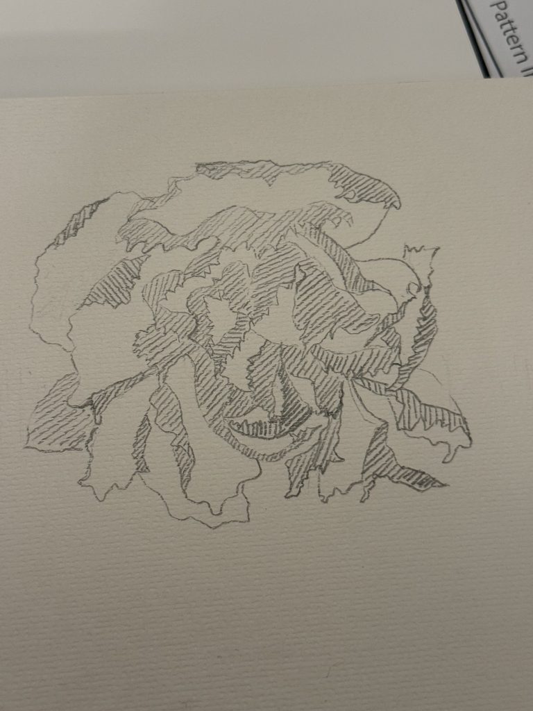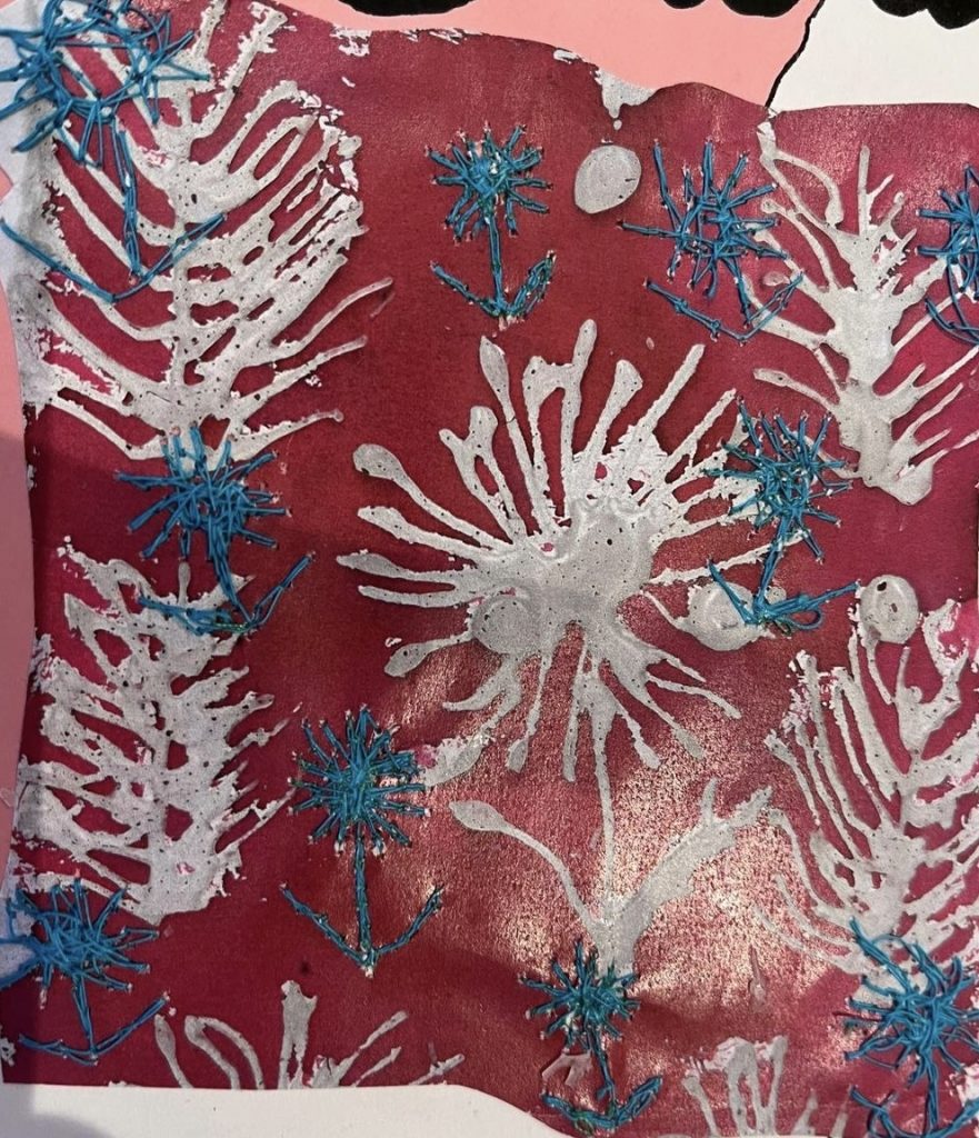 6.For this pattern, my inspiration came from an unusually shaped flower I found at the Botanical Gardens in my hometown in South Wales. When I first saw it, I was drawn to its imperfect beauty, some of its petals were missing, yet that made it feel even more special and full of character. It reminded me that even things that look a little broken can still be beautiful, and I wanted to bring that feeling to life in my work. While I was at home, I had access to all of my art materials, so I made sure to make the most of them. I experimented with a hot glue gun on cotton fabric to capture the flower’s texture and movement, then added blue dye ink around the glue, which gave the piece a calm and expressive quality, almost as if the flower was coming back to life. I later decided to develop this pattern further by experimenting digitally on my laptop. I played around with copying, repeating, and rotating the image in different shapes and angles, and I felt excited watching it transform each time. This process made me feel more confident and creative, it reminded me how much I enjoy exploring new techniques and helped me strengthen my editing skills while discovering new ways to present my work.