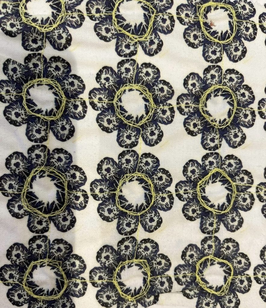 7.After that, I decided to print the pattern onto white cotton fabric using a heat press to see how it would turn out, and I loved the result. I like how the repetition gives the design a sense of balance and structure while still feeling organic and natural. The addition of the yellow thread, sewn in using a sewing machine, adds a lovely touch of colour and character that brings warmth and personality to the piece.