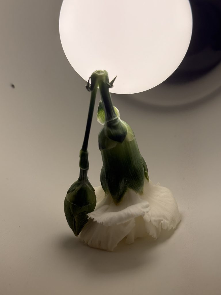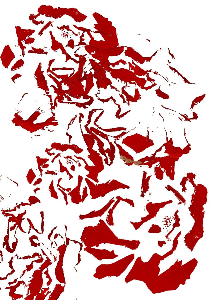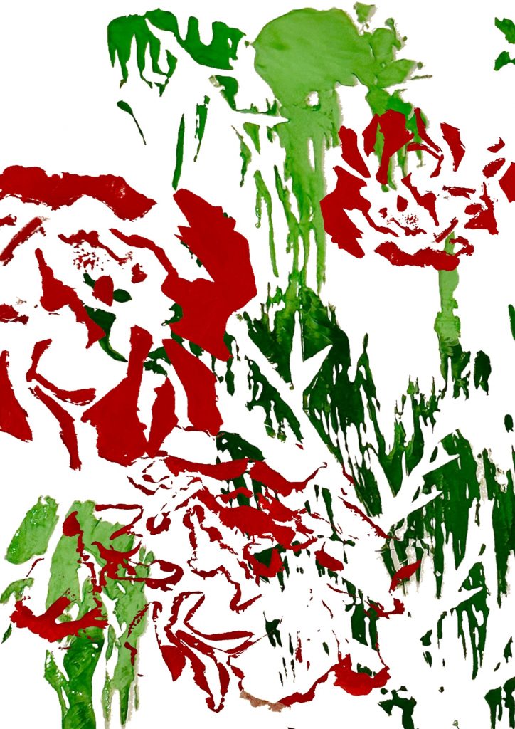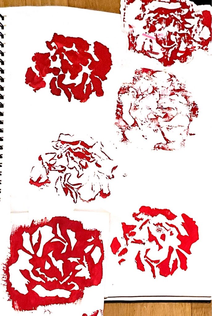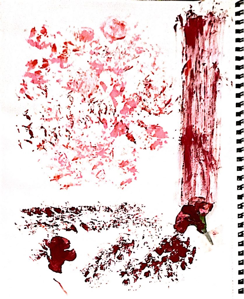 Through this project, I learned to observe objects and summarize them through drawing. I observed a bunch of flowers as a whole and drew the overall shape of the entire bunch. Not only that, I also observed the bunch of flowers from a local perspective: for instance, the different varieties of flowers in the bunch, each with its own unique appearance. I summarized the shape of each type of flower. Among them, I particularly liked the roses, so I drew a rose and observed its positive and negative shapes. I kept the shadowed parts and hollowed out the rest with a knife. I found that the shadow it cast under light was also very beautiful. Finally, I used red paint for printing and discovered that different amounts of paint produced different effects. I also tried the same method on thin leaves and obtained different results from the flowers. Perhaps this is due to the different textures of leaves and flowers. I learned a lot. I also used the 3D observation method, randomly arranging these flowers together and converting the 3D into 2D through drawing. Simple and abstract lines on black cardstock had a stronger visual impact. Finally, I selected some of the parts I liked from all the results and replicated and collaged them on Procreate, enhancing the visual effect through deformation and positive and negative shape effects. In summary, from this project, I learned to draw from the whole to the part and became more sensitive to shapes and colors.