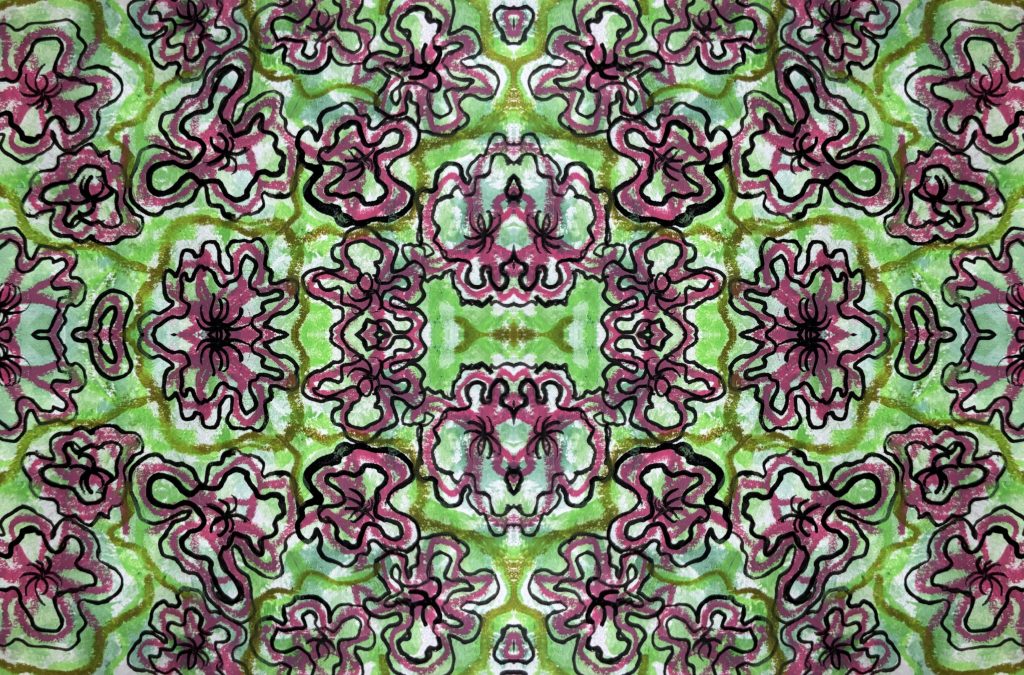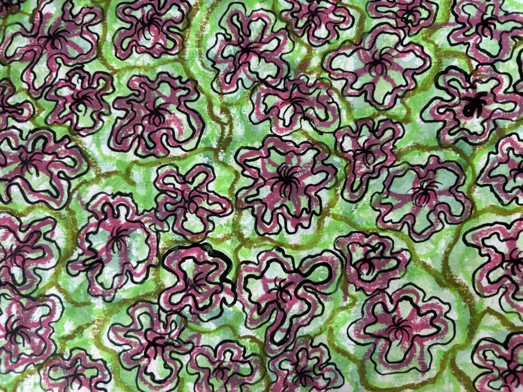 This pattern was inspired by a beautiful flower I encountered during my visit to Kensington Gardens. As I wandered through the park, the vibrant pinkcolour immediately caught my eye. I was also drawn to the flower’s unique shape, it stood out distinctly from the others around it. The texture was equally fascinating, almost inviting me to reach out and feel its form. The backdrop of lush, varied shades of green only enhanced the flower’s presence, and I could already envision a dynamic pattern beginning to take shape. To capture both beauty and texture of what I saw, I explored a range of materials in my own work. I used watercolours for softness, oil pastels for depth, black felt pens for bold definition, and coloured fine-tip pens to bring in detail. Eahc medium added a different dimension to the piece.