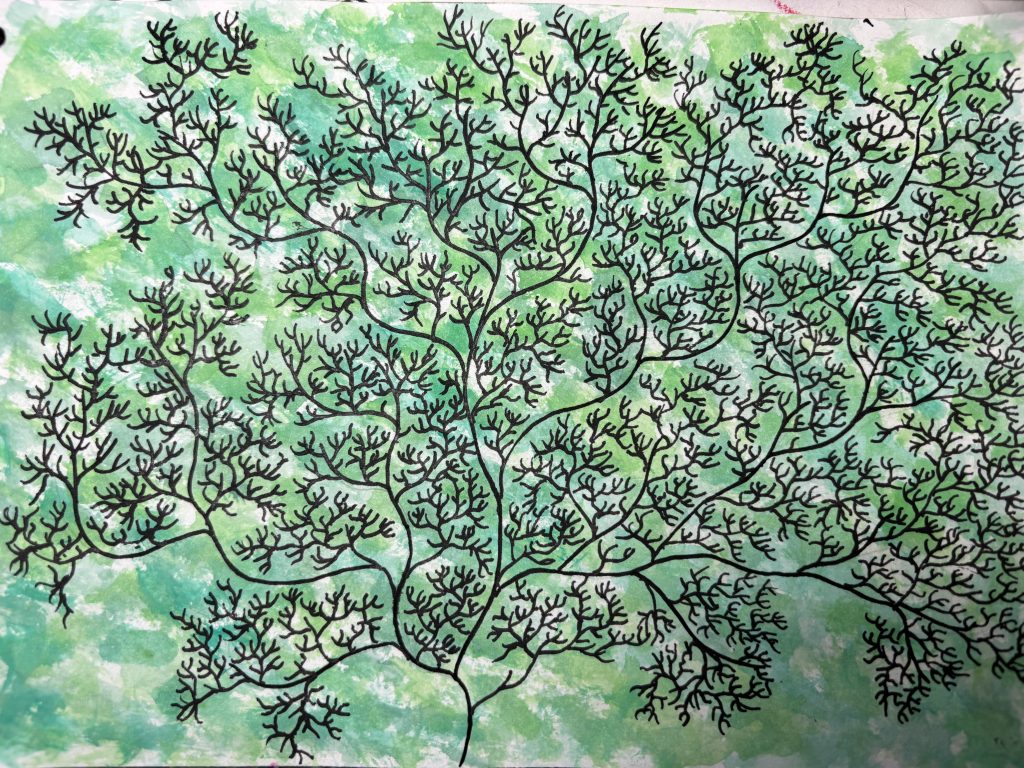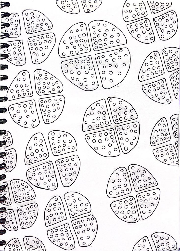5. This pattern was inspired by a close-up of a green leaf I found in my local park. As I started observing it, I became fascinated by all the tiny details, especially the veins, which created such a beautiful and natural pattern. I really enjoyed following the curves and marks, almost like tracing the leaf’s story. Using a fine black pen made those details stand out in a way that felt bold and expressive. Adding different shades of green watercolour in the background gave it a soft, calming feel that reminds me of being surrounded by nature.