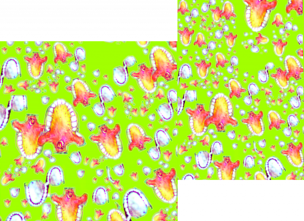 I took the motif and digitalised it, experimenting with composition and colourways while adjusting opacity and layering. I feel this effectively created a strong sense of depth in the piece.
