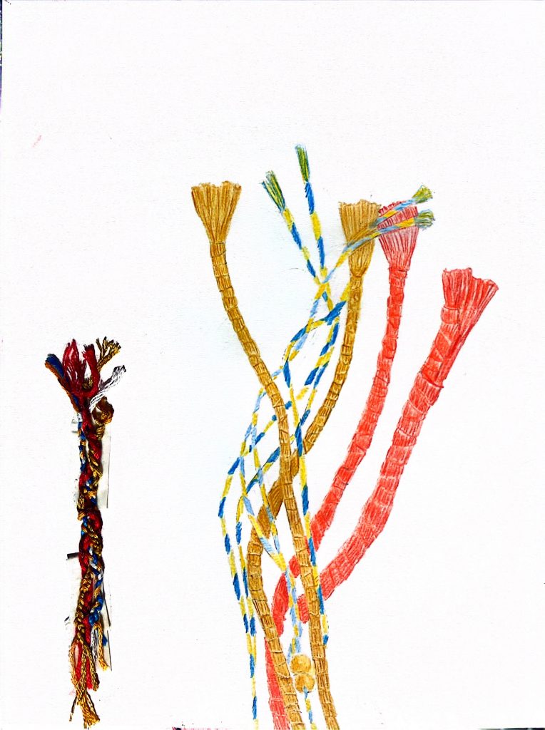 5. On the left, I enlarged a detail of my gourd rope and reproduced it using embroidery thread. On the right, I achieved a similar effect using colored pencils.