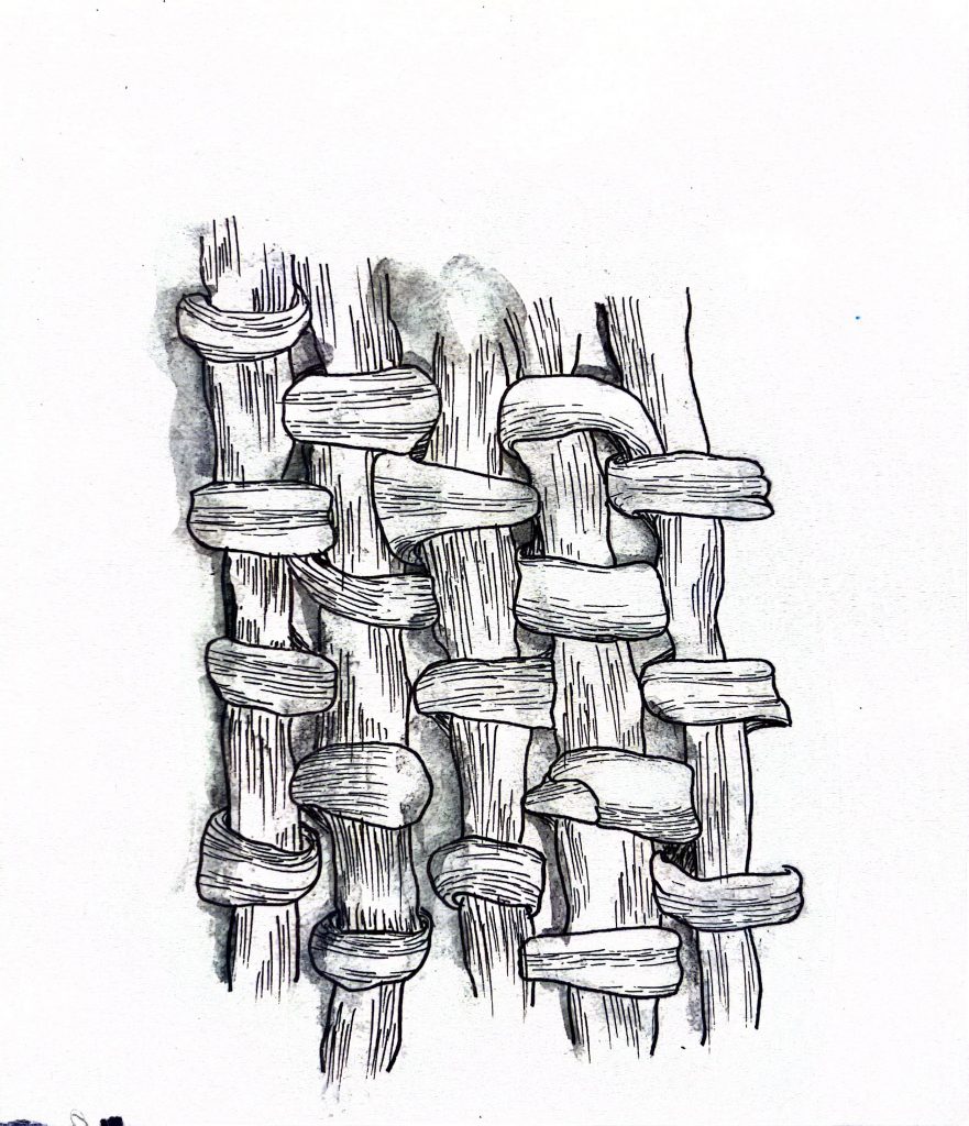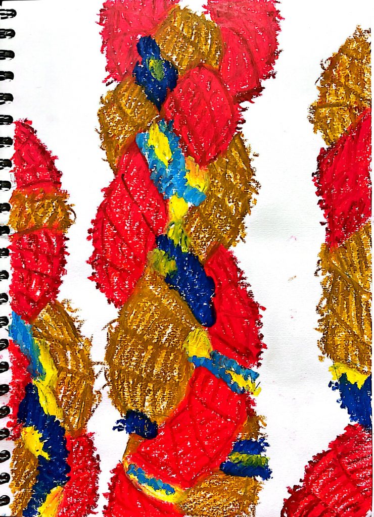 6. I zoomed in further on the gourd rope, opted for oil pastels, filled in the pencil sketch with them, and used the edge of the pastel to depict the frayed strands of the rope.