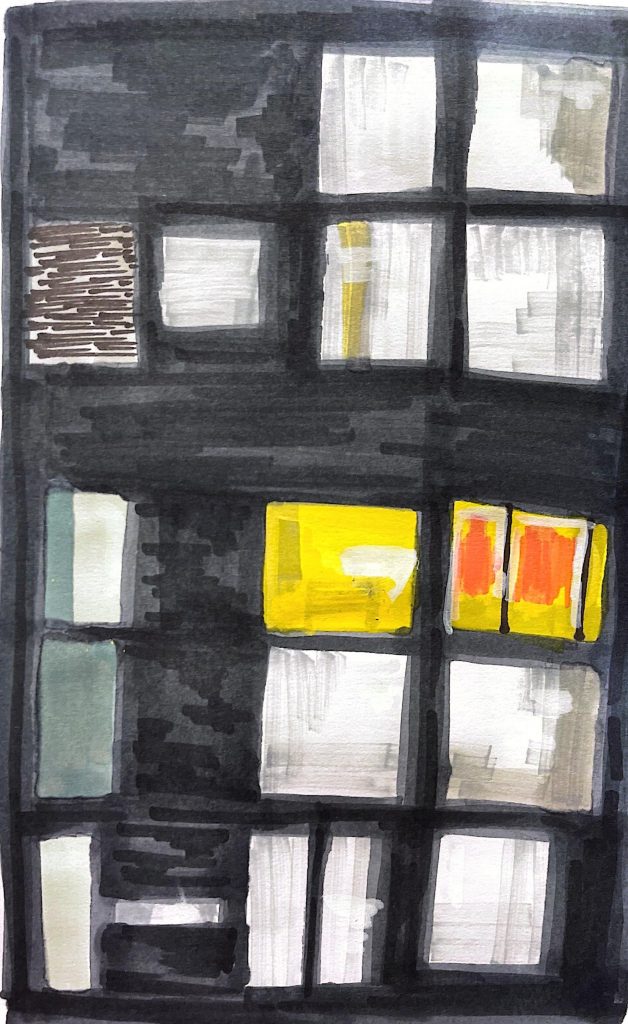 7. This piece was inspired by a moment when I was painting late into the night. I looked up and noticed the striking contrast between the lit windows and the dark walls of the building across from me.