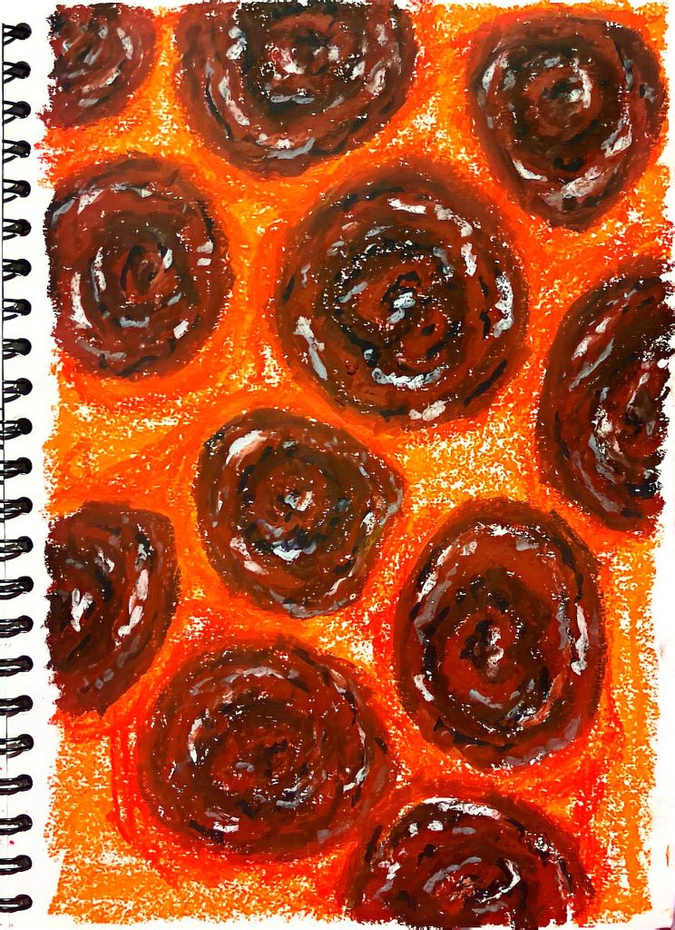 This is based on the bottom of my gourd, which I chose to draw repeatedly. I used oil pastels to recreate its rough texture and layered colors to achieve a more blended effect.