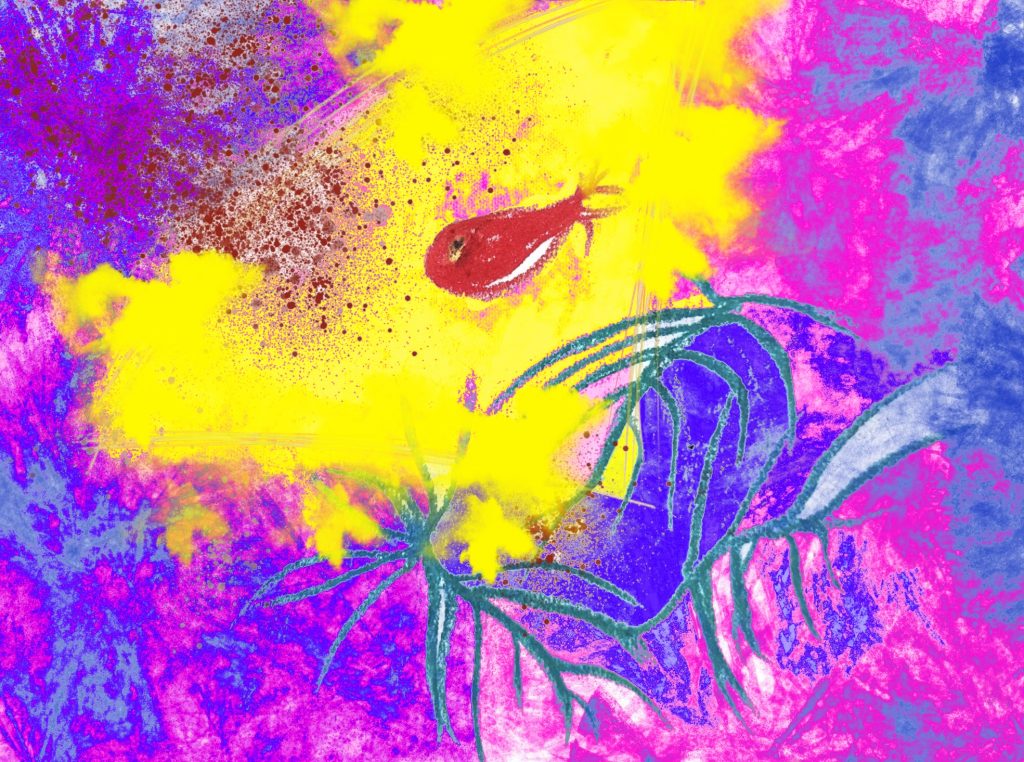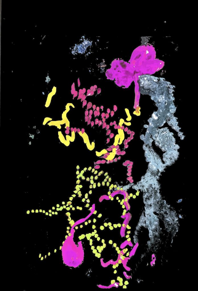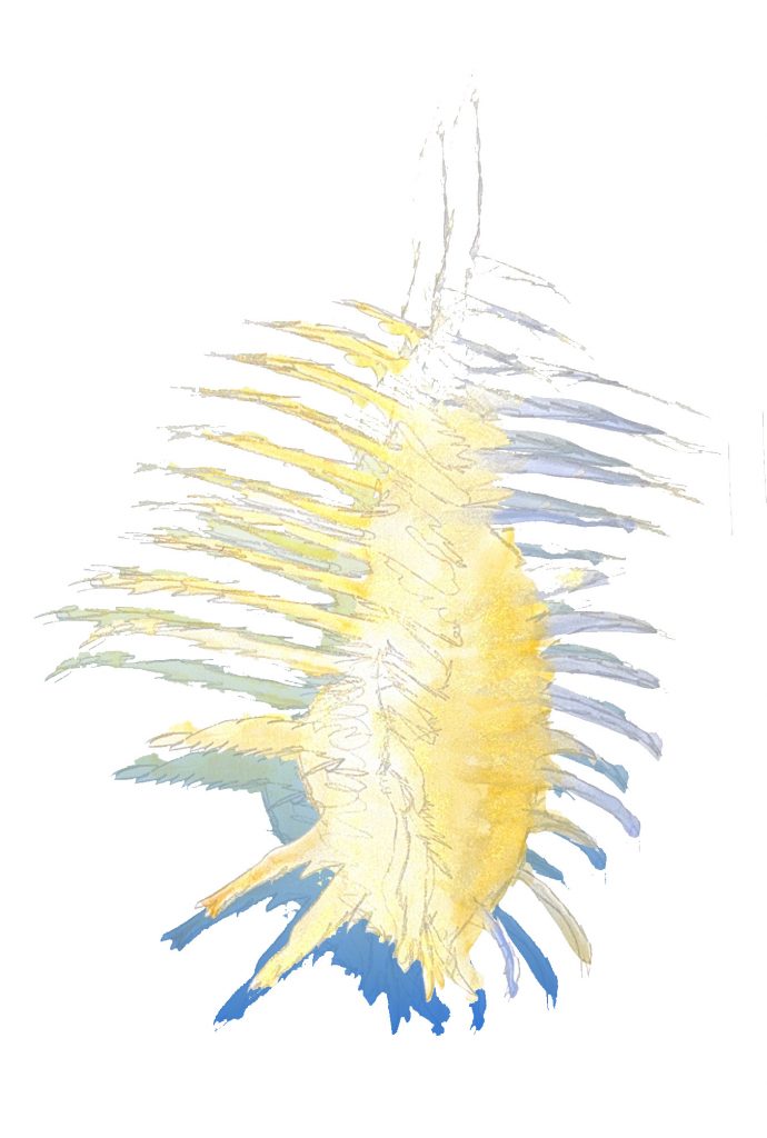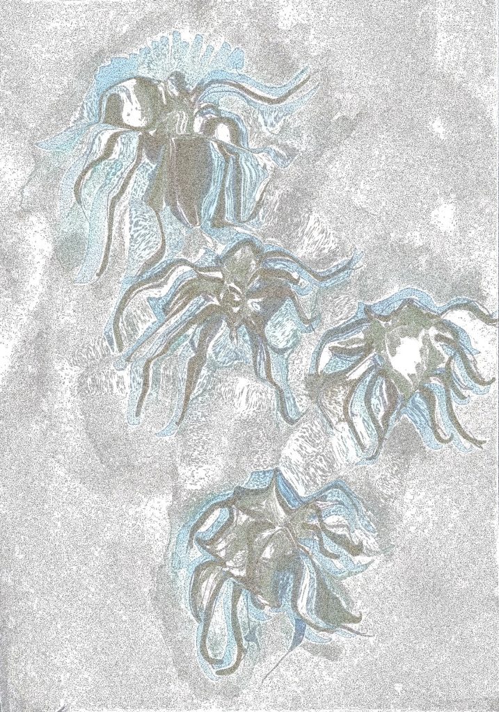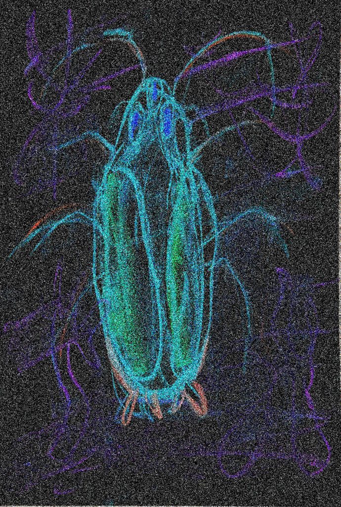 All my inspiration starts with things from real life—exhibits in natural history museums, combined with my recent subterranean exploration at the Horniman Museum, gave rise to these fantastical worlds. Covering fossils of marine life and ocean species, extending to terrestrial creatures such as birds and insects, this journey from sea to land embodies the infinite potential for life’s continuity within nature. Throughout my discourse, I express a sense of inspiration— This inspiration stems from living fossils and the evidence they provide of life’s existence, demonstrating the innate drive for biological evolution. I have integrated this evolutionary mechanism with my own vision of the world, using this instinctive drive to transport them into an alternate, fantastical realm. One can also observe the altered colouration of certain species, This is as I contrast their original forms with the imagined reconstructions I have created for them. During the creative process, I tried every means to incorporate more visual elements into the illustrations themselves. Thus, after completing each piece on paper—merely as a drawing on paper—I further edited them in Photoshop to imbue the textures with greater visual depth. Many of these effects were achieved through Photoshop filters.All the chromatic patterns are based on biological species, their appearance, form, body structure, internal anatomy, and the anatomical illustrations displayed in museums. My outlining of the lines and forms of living creatures draws from this source.As for why I chose them, it is because I wish to undertake a secondary construction of life, to rebuild a space existing beyond the three-dimensional world. The contradictions within it can, to some extent, be understood as an alien space, though not entirely one populated by monstrous and mutated creatures.