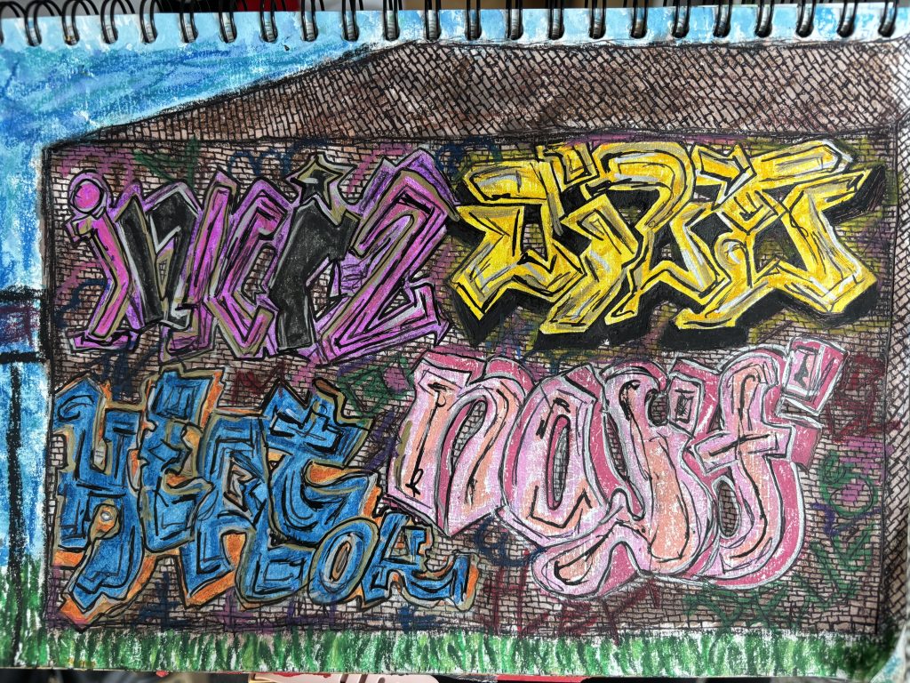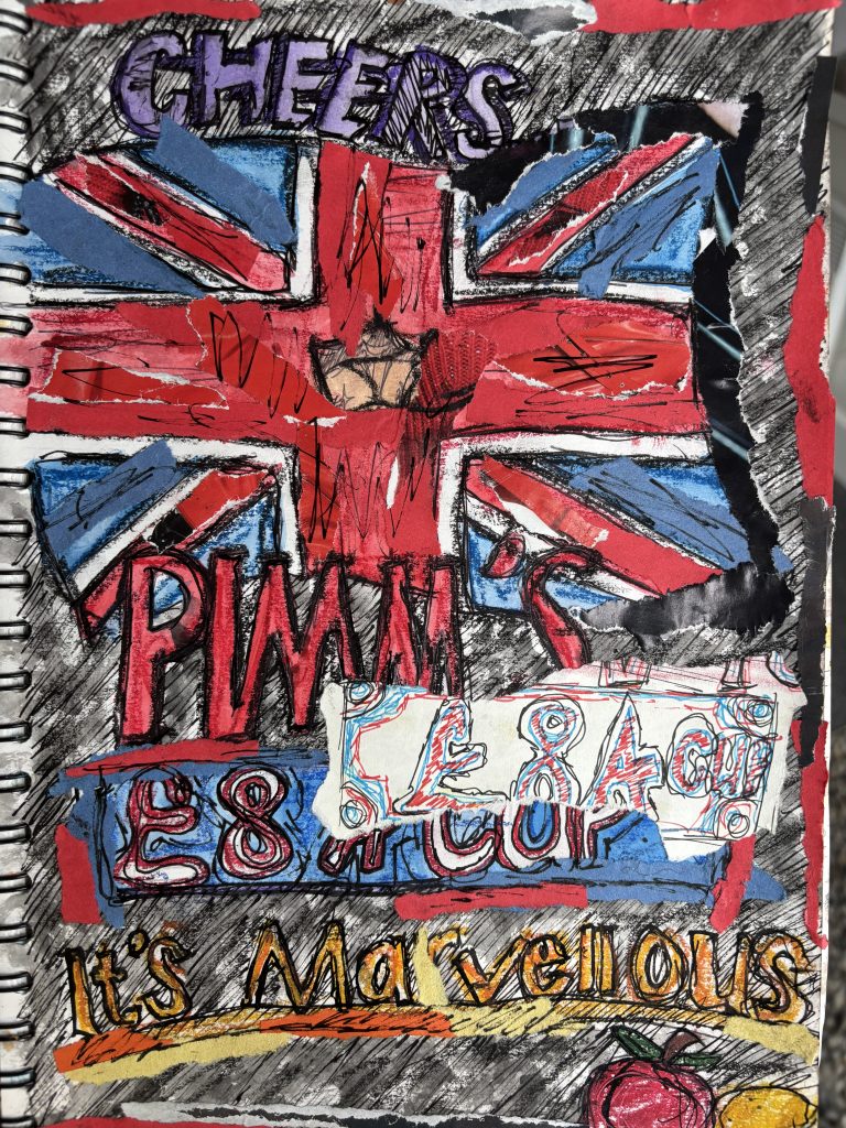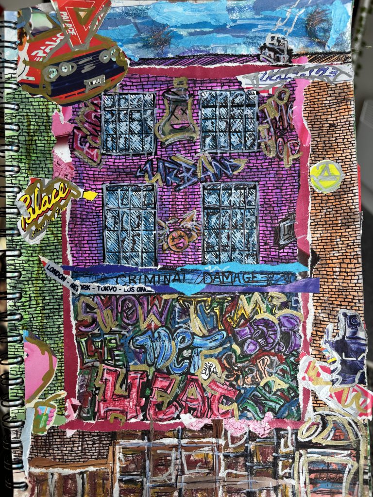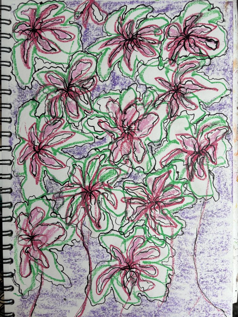 9. This drawing was inspired by a plant pot I came across in my local café. Something about its simple design caught my attention, and I wanted to capture that feeling in my work.To create the pattern effect, I used layers of ripped coloured tissue paper for the background, which turned out really interesting. I love how the different colours overlap and blend with each other, creating new blocks of colour and subtle transitions. It adds so much texture and depth to the piece, making it both visually engaging and fun to touch and look at. This pattern was created through freehand mark-making, where I focused on movement and expression rather than precision. I loved the feeling of letting my hand flow naturally, allowing each mark to develop its own rhythm. The overlapping lines and varied textures give the piece a lively and spontaneous energy.