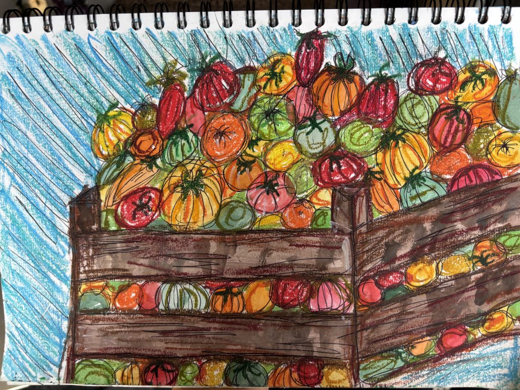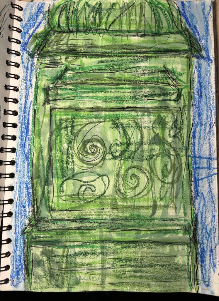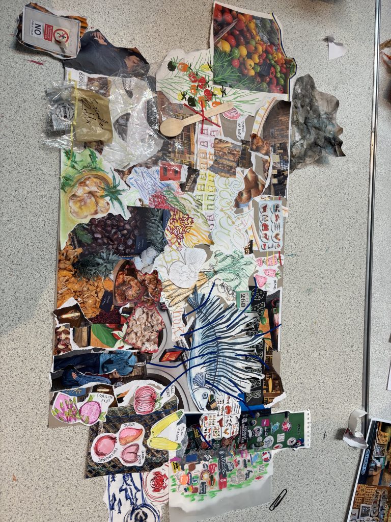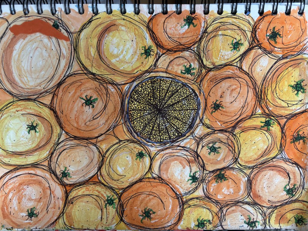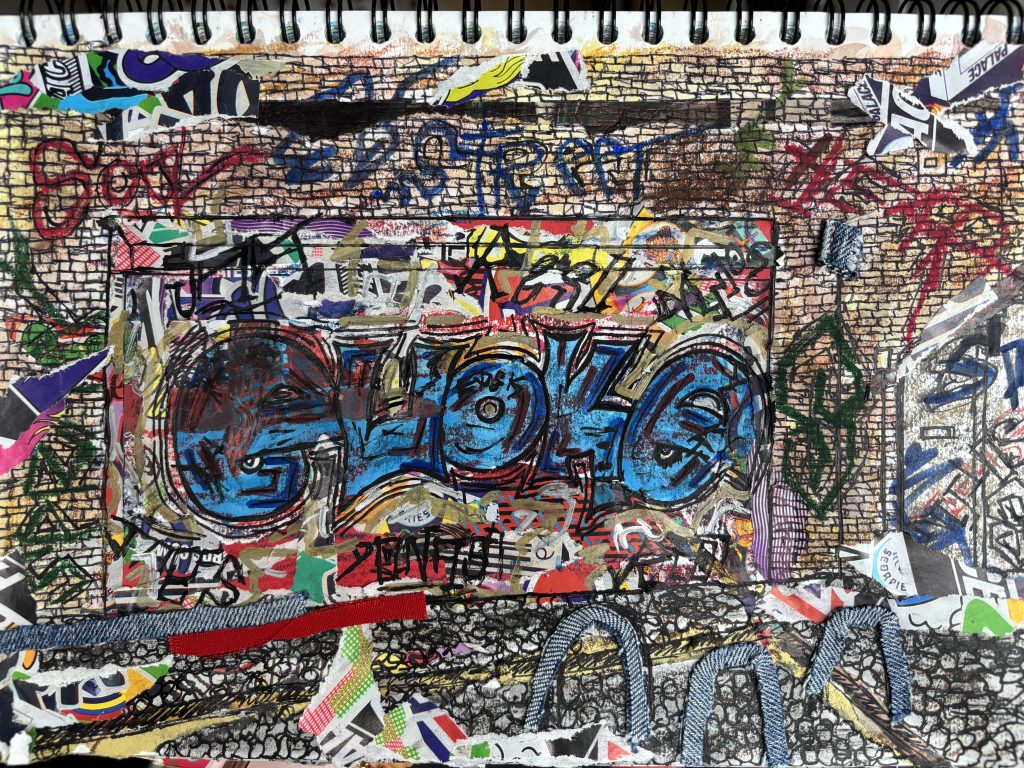9. This drawing was inspired by a plant pot I came across in my local café. Something about its simple design caught my attention, and I wanted to capture that feeling in my work.To create the pattern effect, I used layers of ripped coloured tissue paper for the background, which turned out really interesting. I love how the different colours overlap and blend with each other, creating new blocks of colour and subtle transitions. It adds so much texture and depth to the piece, making it both visually engaging and fun to touch and look at. This pattern was created through freehand mark-making, where I focused on movement and expression rather than precision. I loved the feeling of letting my hand flow naturally, allowing each mark to develop its own rhythm. The overlapping lines and varied textures give the piece a lively and spontaneous energy.