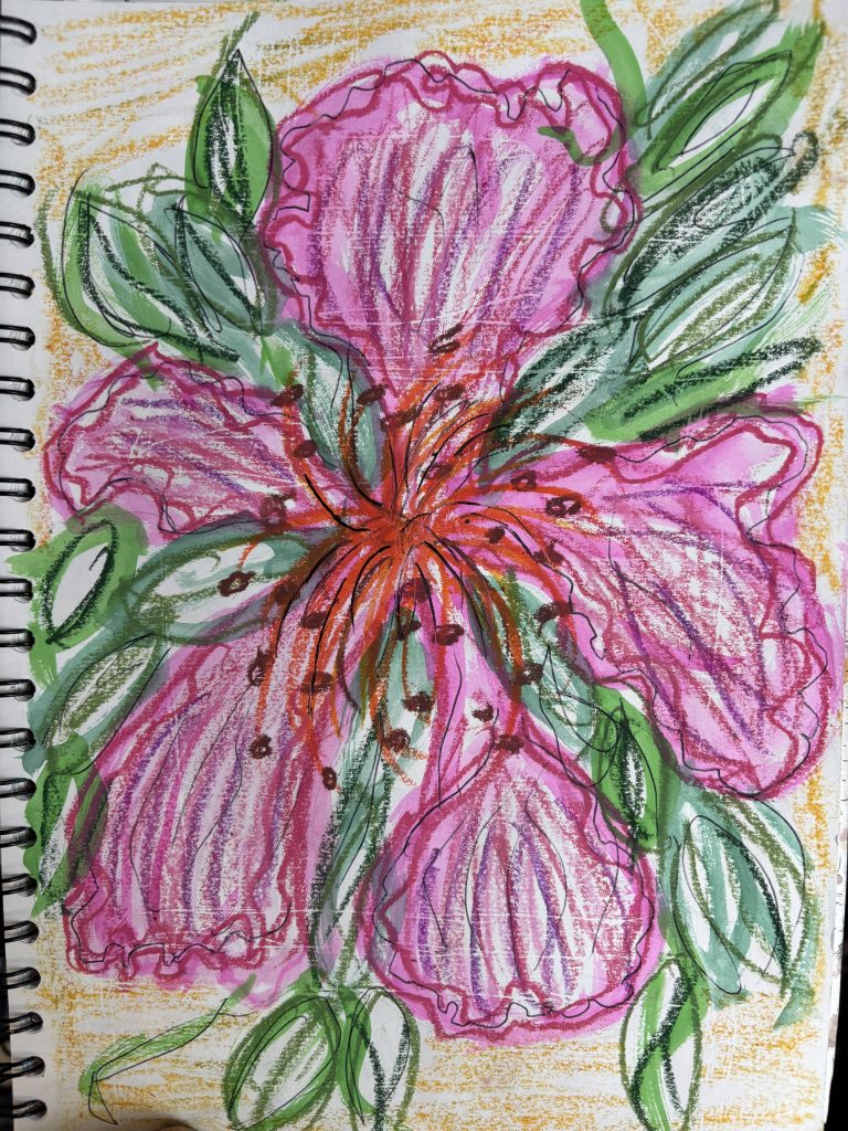 - This pattern was inspired by a beautiful flower I encountered during my visit to Kensington Gardens. As I wandered through the park, the vibrant pinkcolour immediately caught my eye. I was also drawn to the flower’s unique shape, it stood out distinctly from the others around it. The texture was equally fascinating, almost inviting me to reach out and feel its form. The backdrop of lush, varied shades of green only enhanced the flower’s presence, and I could already envision a dynamic pattern beginning to take shape. To capture both beauty and texture of what I saw, I explored a range of materials in my own work. I used watercolours for softness, oil pastels for depth, black felt pens for bold definition, and coloured fine-tip pens to bring in detail. Eahc medium added a different dimension to the piece.