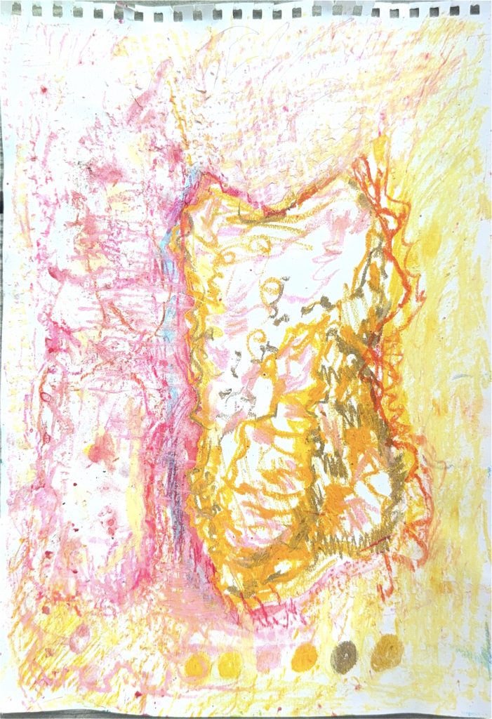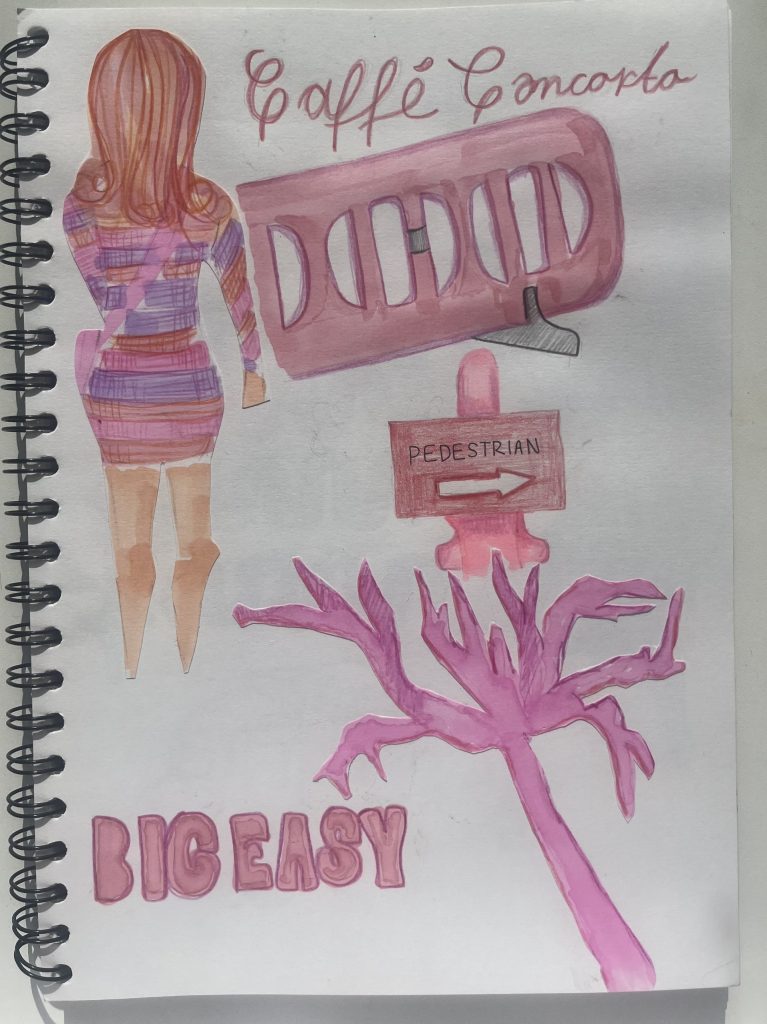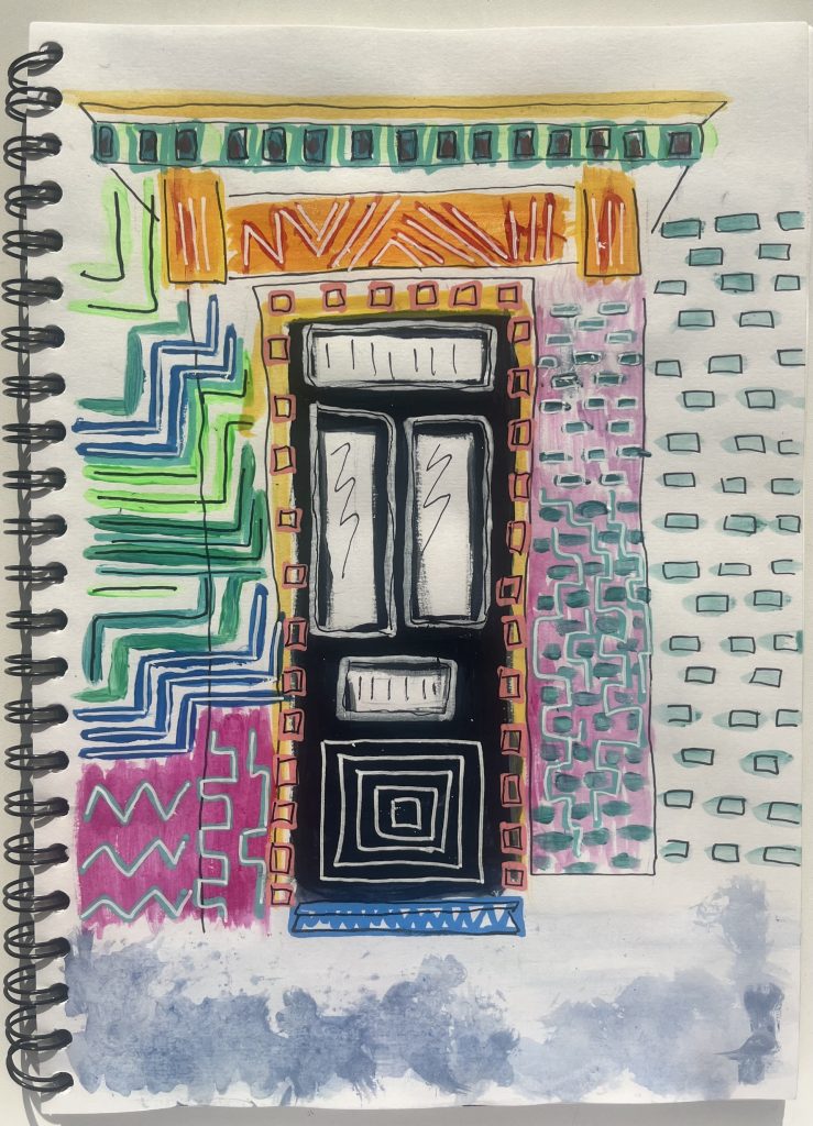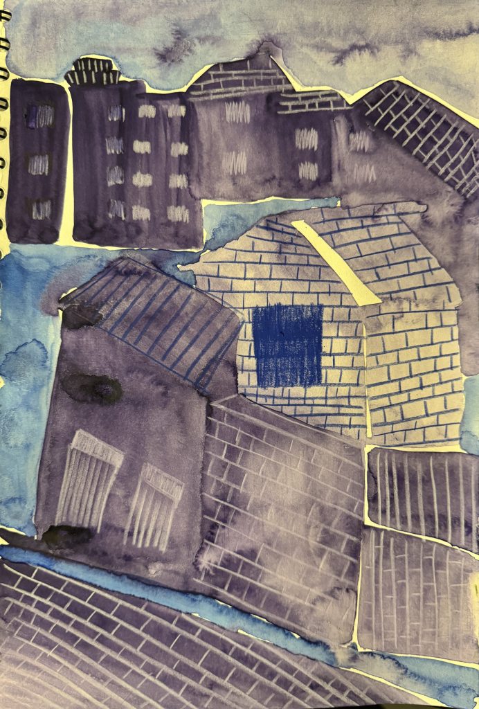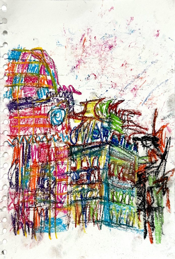 3. This third drawing was inspired by a vibrant shopfront in Camden Town that immediately caught my eye. I was drawn to it’s stricking pink brick wall and the bold graffiti artwork covering the roller shutter front door. The building was bursting with colour, creating lively and captivating scene. To bring this energy into my drawing, i used a mix of techniques and materials, including watercolours, oil pastels, coloured felt-tip pens, and even ripped magazine paper iIcollected from a stall in Camden Market.