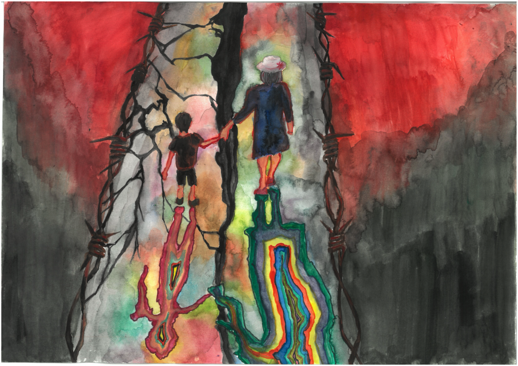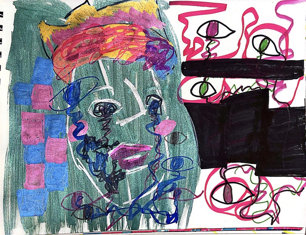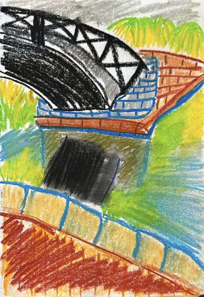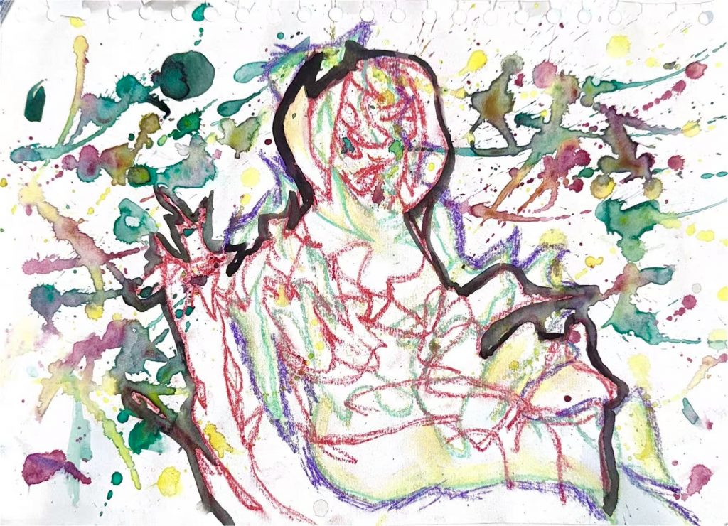 3. This third drawing was inspired by a vibrant shopfront in Camden Town that immediately caught my eye. I was drawn to it’s stricking pink brick wall and the bold graffiti artwork covering the roller shutter front door. The building was bursting with colour, creating lively and captivating scene. To bring this energy into my drawing, i used a mix of techniques and materials, including watercolours, oil pastels, coloured felt-tip pens, and even ripped magazine paper iIcollected from a stall in Camden Market.