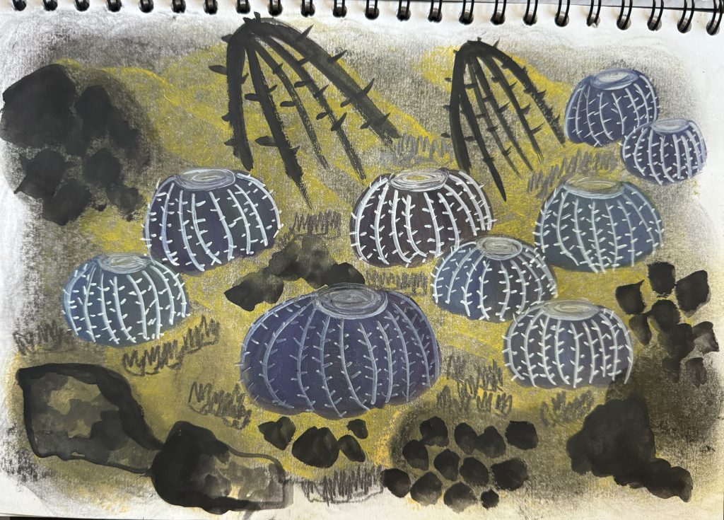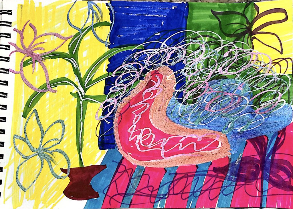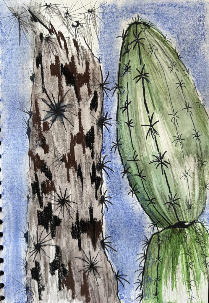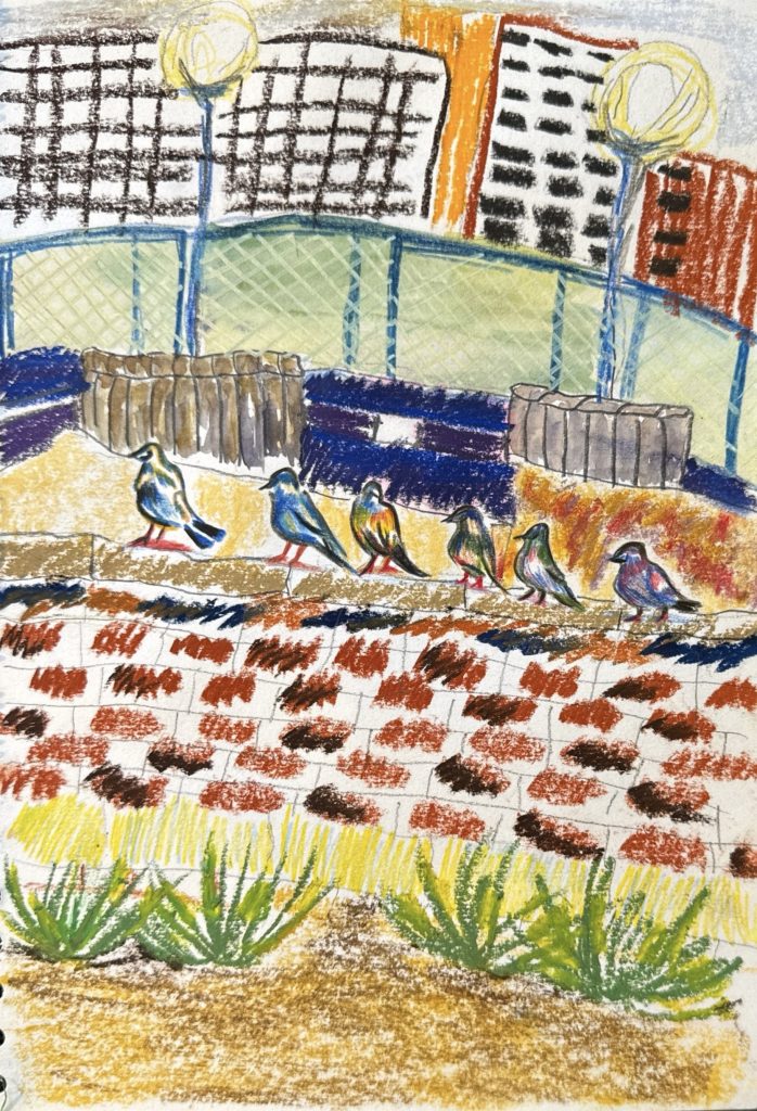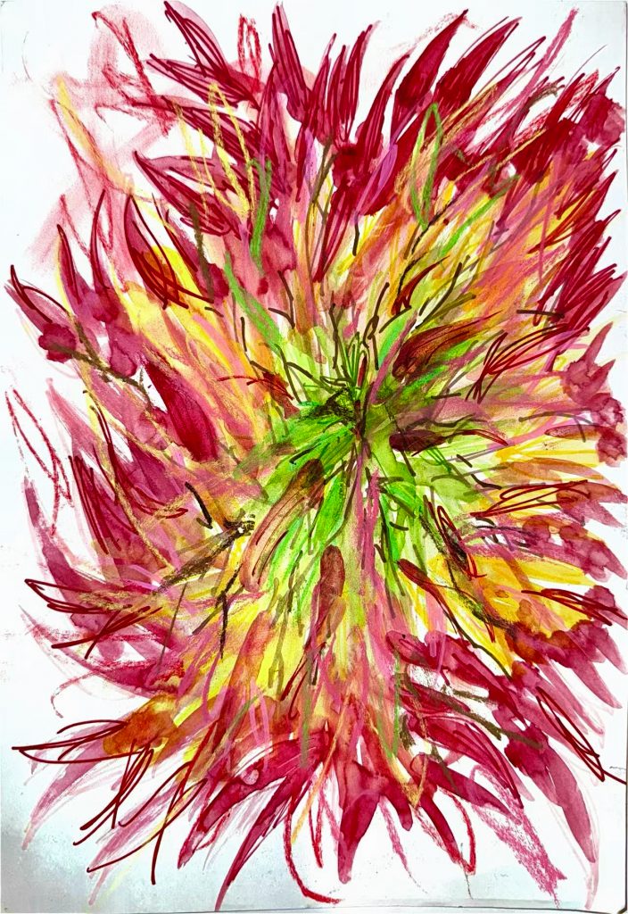 8. My eighth drawing was inspired by a cluster of vibrant flowers I often see during my daily walks in the local park near where im staying. Their bold colours and unique shapes never fail to catch my eye, and i felt compelled to capture their beauty on paper. For this piece, i used a combination of watercolours, oil pastels and black marker pens to bring out their vividness and detail.