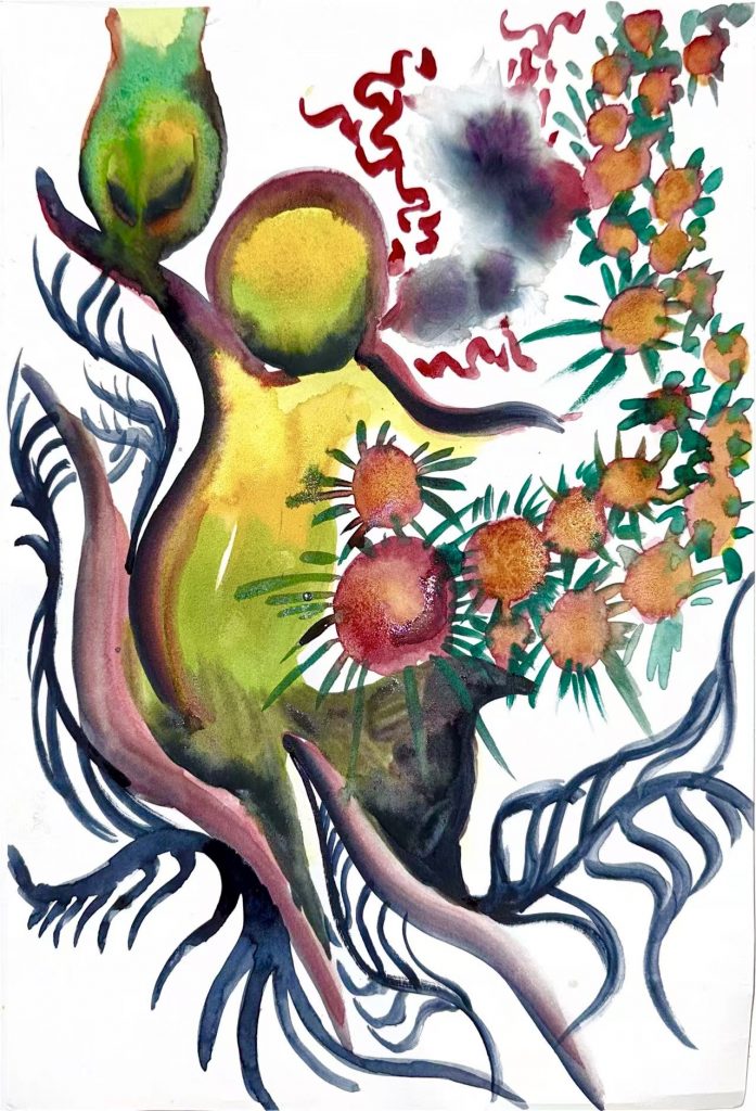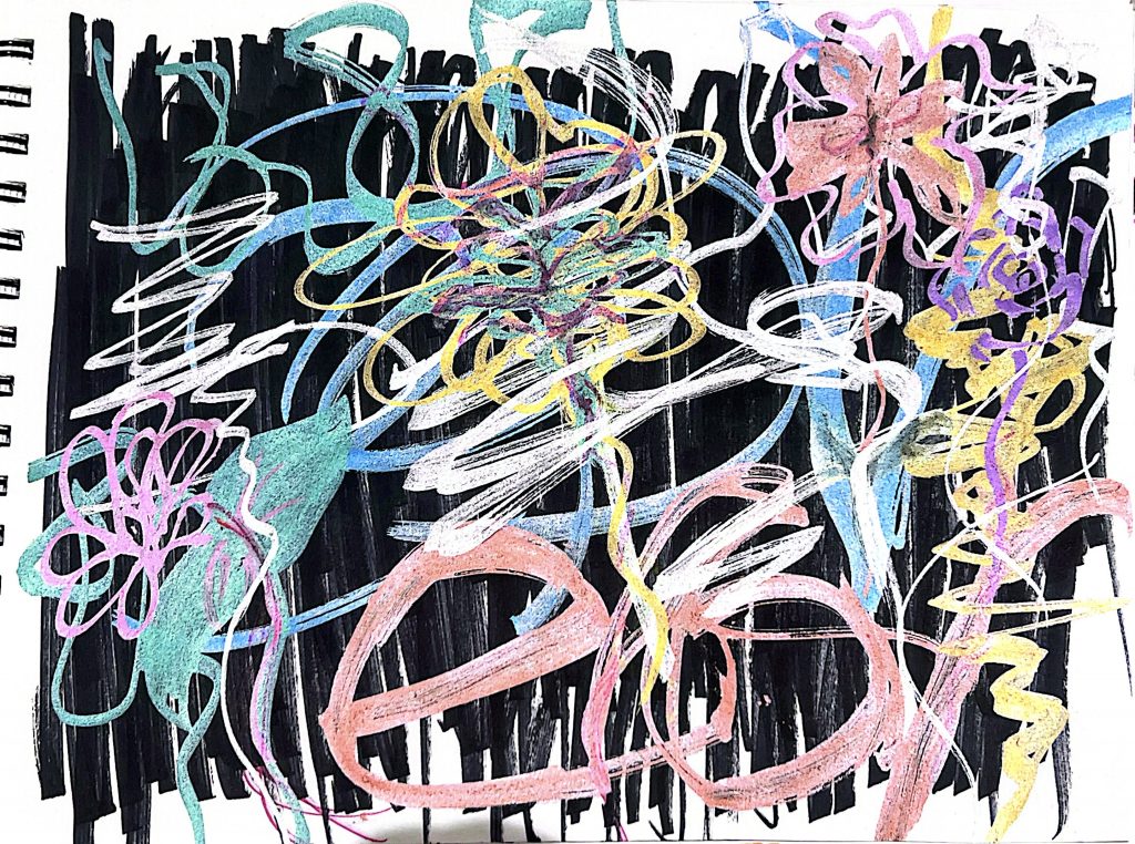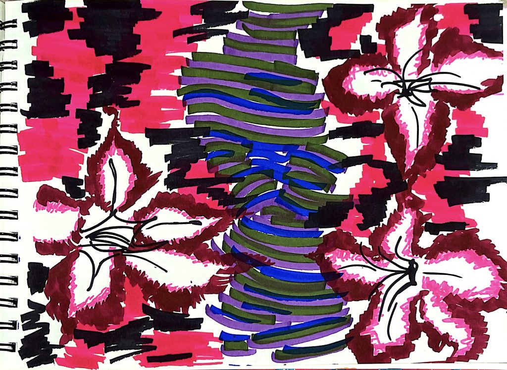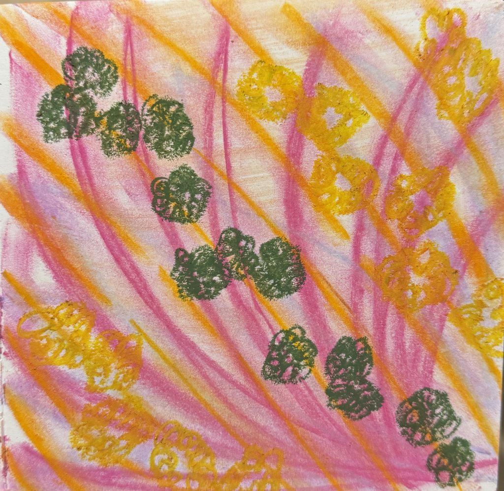 8. My eighth drawing was inspired by a cluster of vibrant flowers I often see during my daily walks in the local park near where im staying. Their bold colours and unique shapes never fail to catch my eye, and i felt compelled to capture their beauty on paper. For this piece, i used a combination of watercolours, oil pastels and black marker pens to bring out their vividness and detail.