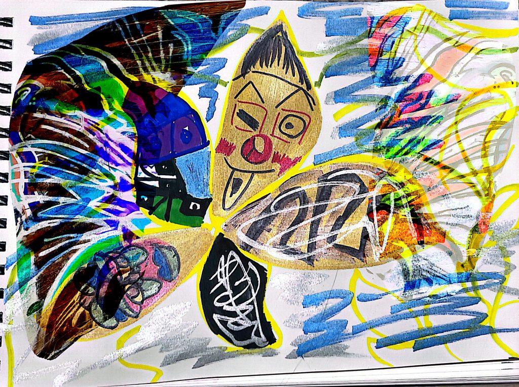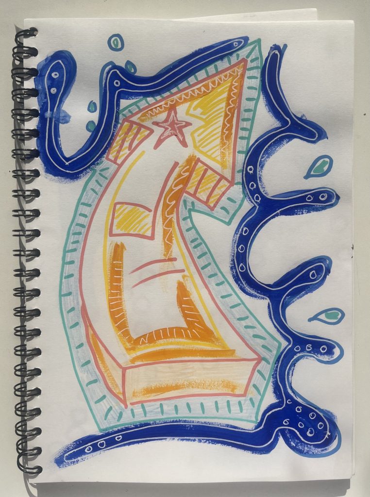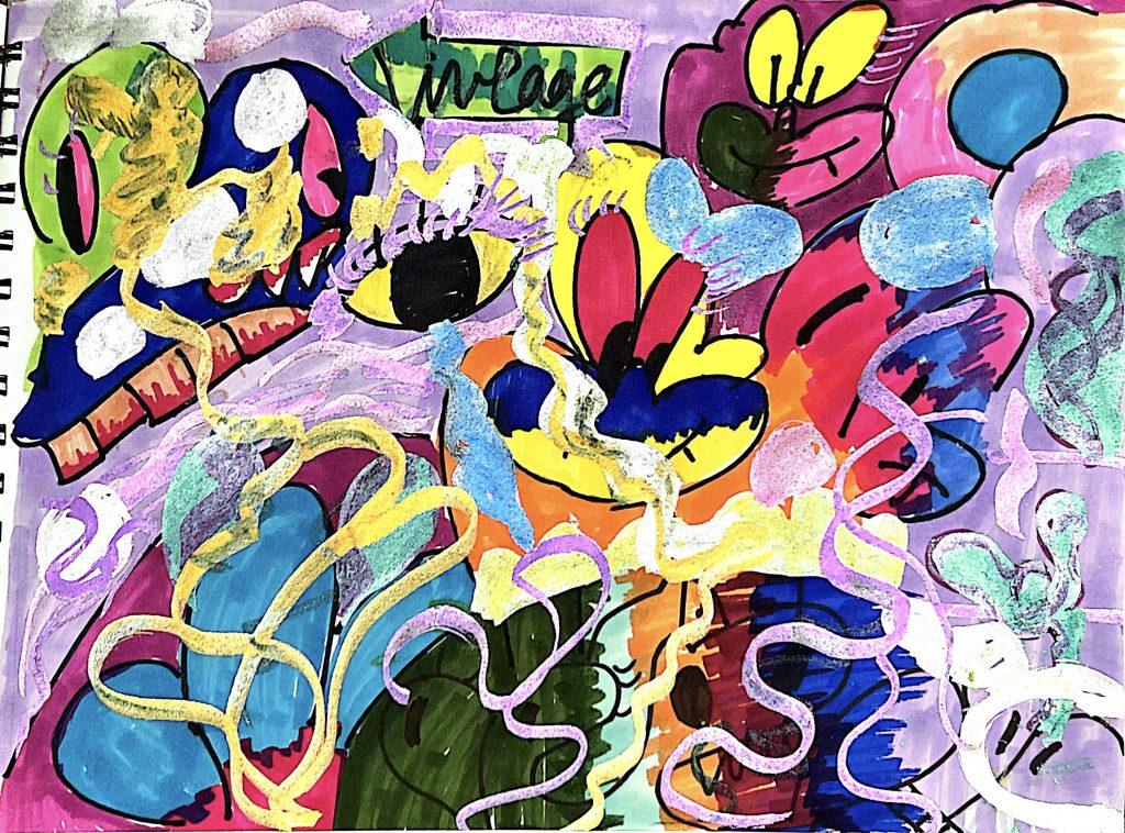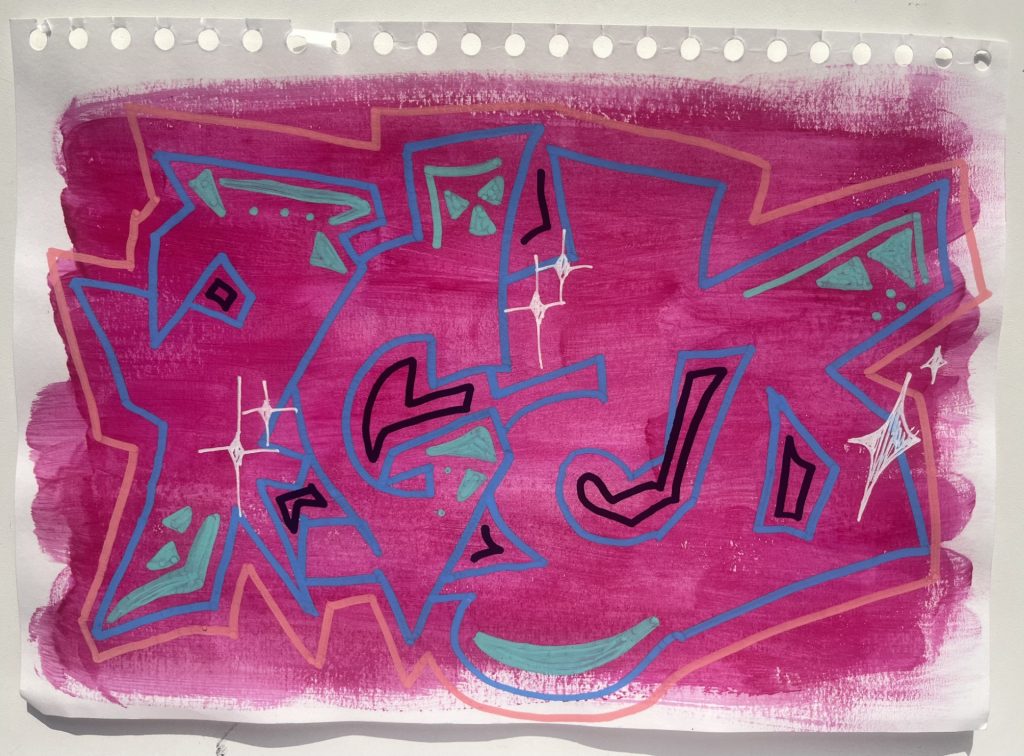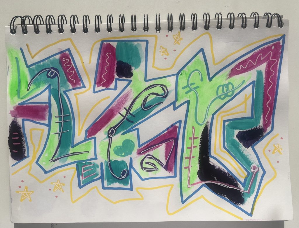 - This Drawing was inspired by a piece of graffiti I came across in an alley near London Bridge. As I walked through the narrow passage, the vibrant artwork on the wall immediately caught my attention – the bold, colourful font was striking, making it interesting to look at. To reflect the texture and style of the original graffiti in my own work, I used a range of techniques. These include water colours, oil pastels, coloured felt-tip pens, ripped coloured paper and denim fabric, allowing me to create layered texture.
