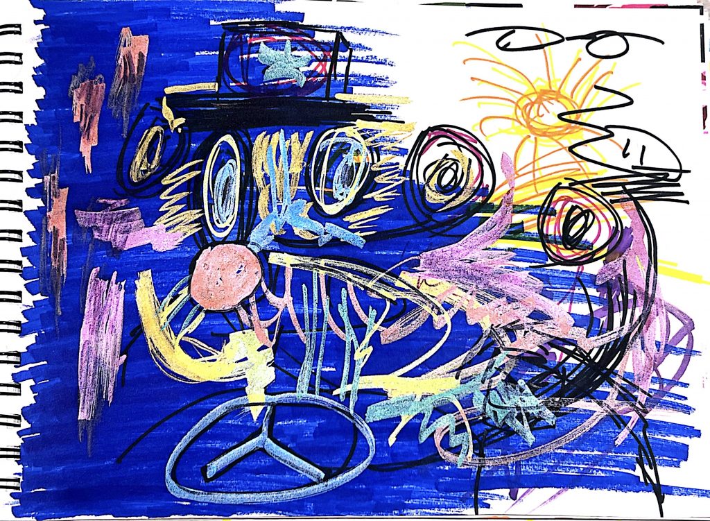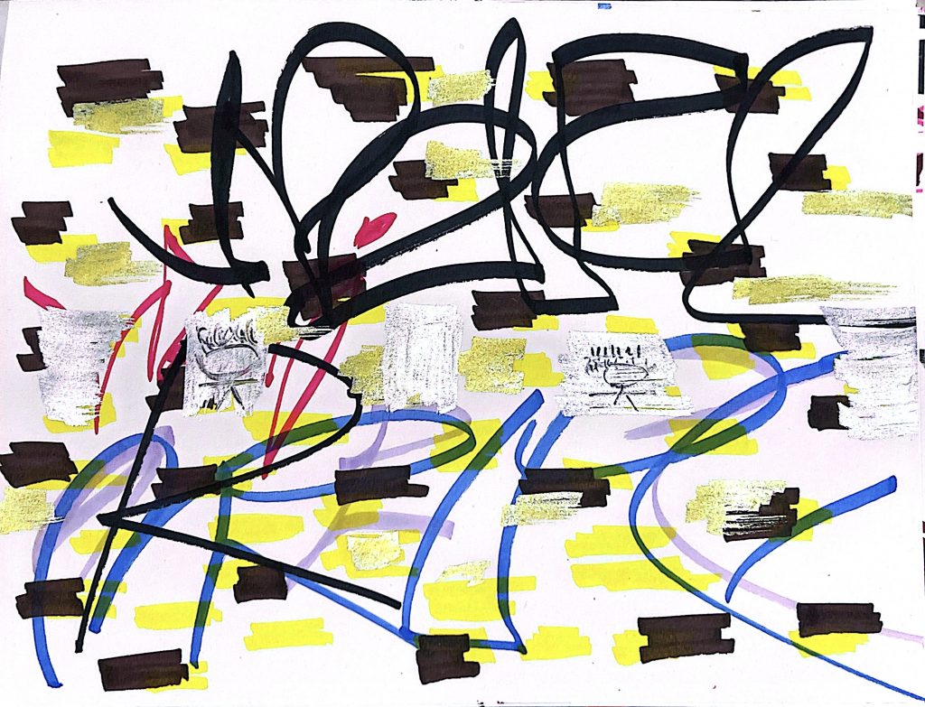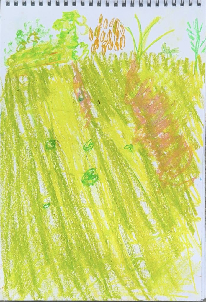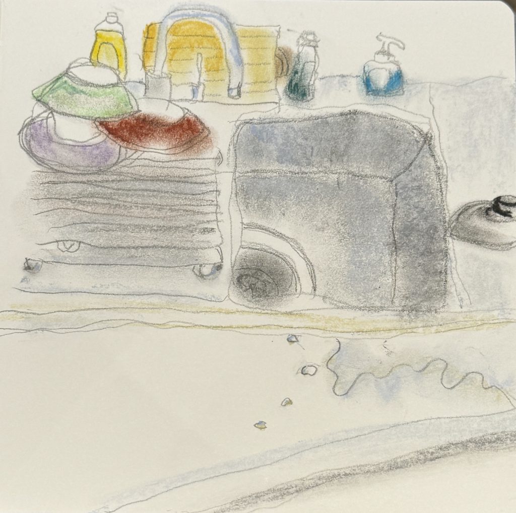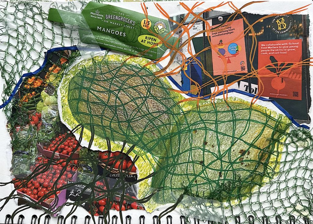 2. This second drawing was inspired by a vibrant coffee stall in Borough Market. Its bold and inviting colour palette stood out among the surrounding stalls, instantly drawing my attention. To capture the warmth of the scene, I experimented with a variety of techniques, including watercolours, oil pastels, felt-tip pens and ripped coloured paper. These materials helped me bring texture and depth into the drawing.