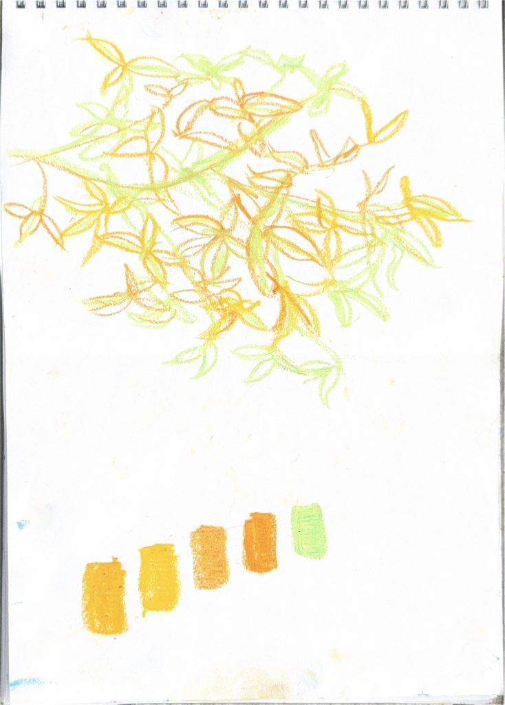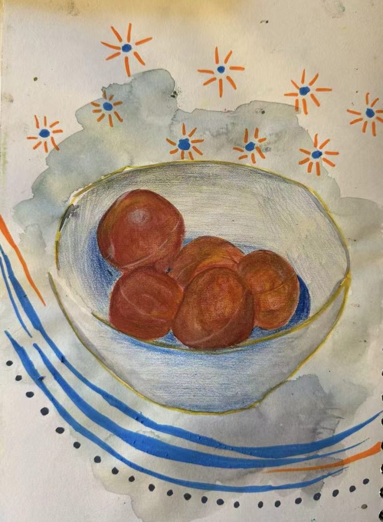 6. This drawing was also inspired by the same colourful fruit and vegtable stall at Borough Market, but this time I chosse to focus on the bright, tropical tones of the oranges. The way they were stacked created a stricking, organic pattern that immediately caught my eye, i had to capture it! I began with a base layer of water colous, then built up texture and detail using oil pastels and fine line felt tips.