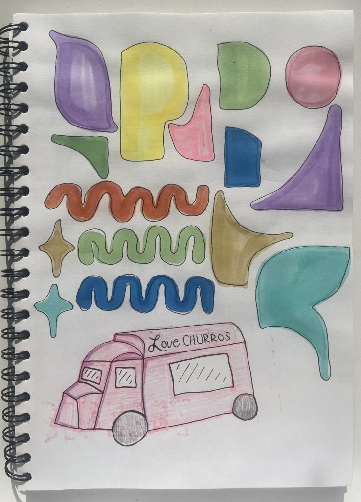 During this talking colour task, I began by focusing on my surroundings, drawing inspiration from some of my faveourite areas in London, particularly Borough Market and Camden Town. While exploring these locations, I took time to observe and experiment with the variety of colours and textures I discovered, capturing them through photographs and quick sketches to develop some initial pattern and colour ideas. At Borough Market, I was initially overwhelmed but also excited by the vibrant and exotic displays of food. The fruit and Vegetable stall especially caught my attention, I had never seen such brightly coloured produce before. The textures and natural patterns of the fruit sparked numerous ideas for how I wanted to represent them in my drawings. For example, I chose to focus on the oranges, tomatoes, a colourful ‘Pimms’ poster, and a nearby coffee stall, each offering unique visual elements that i found inspiring.